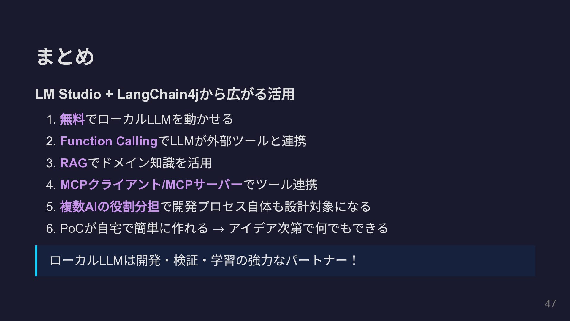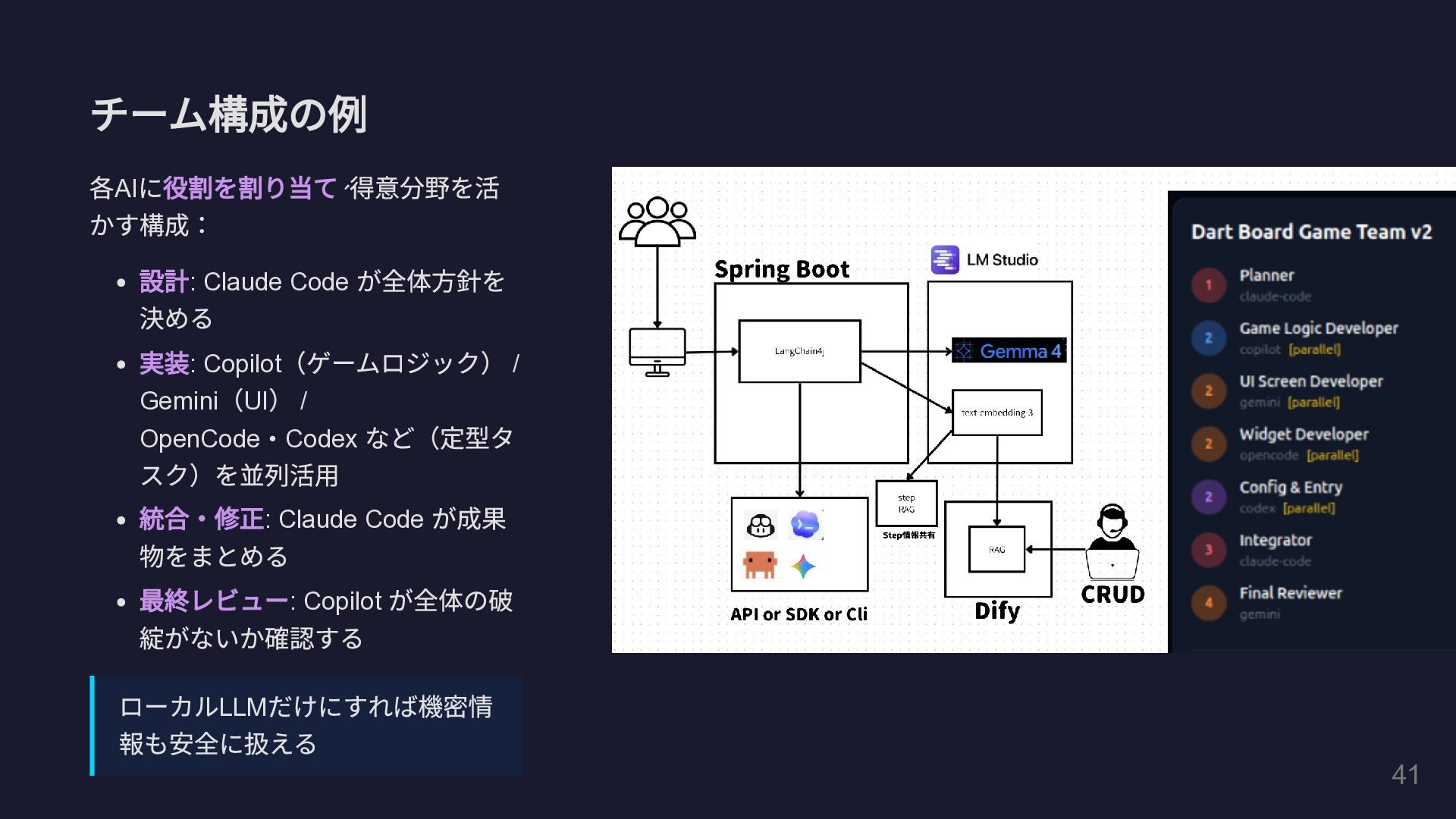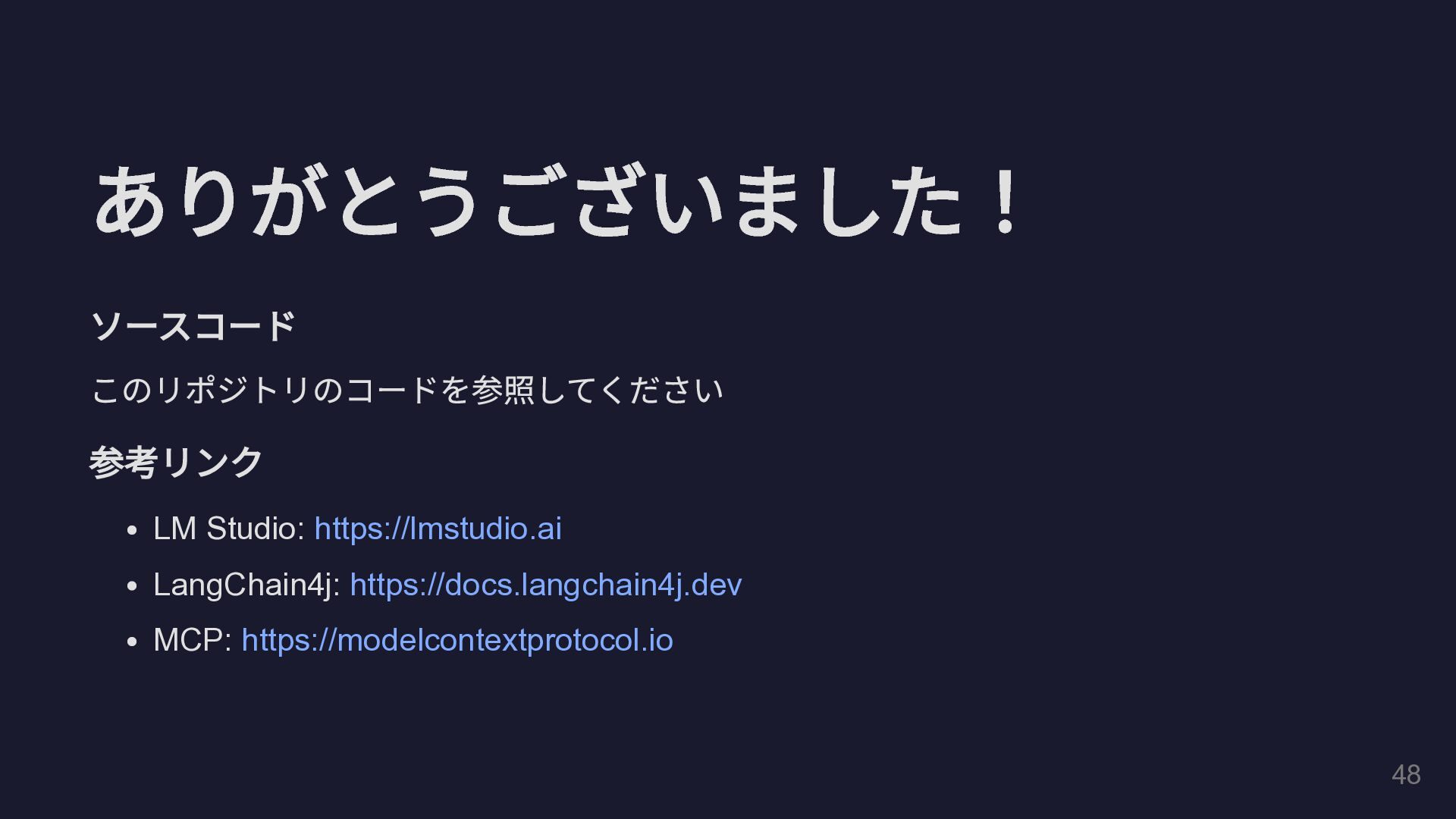 @Tool(""" GitHub Pull Request の全体コメントと インラインコメントの両方を取得して一覧表示します。 """) public String fetchAllPrComments( @P(" リポジトリのオーナー名") String owner, @P(" リポジトリ名") String repo, @P("PR 番号") int prNumber) { // GitHub REST API を HttpClient で直接呼び出し String issueComments = callGitHubApi( "/repos/%s/%s/issues/%d/comments" .formatted(owner, repo, prNumber)); String reviewComments = callGitHubApi( "/repos/%s/%s/pulls/%d/comments" .formatted(owner, repo, prNumber)); // ... 結果を整形して返却 } } 29