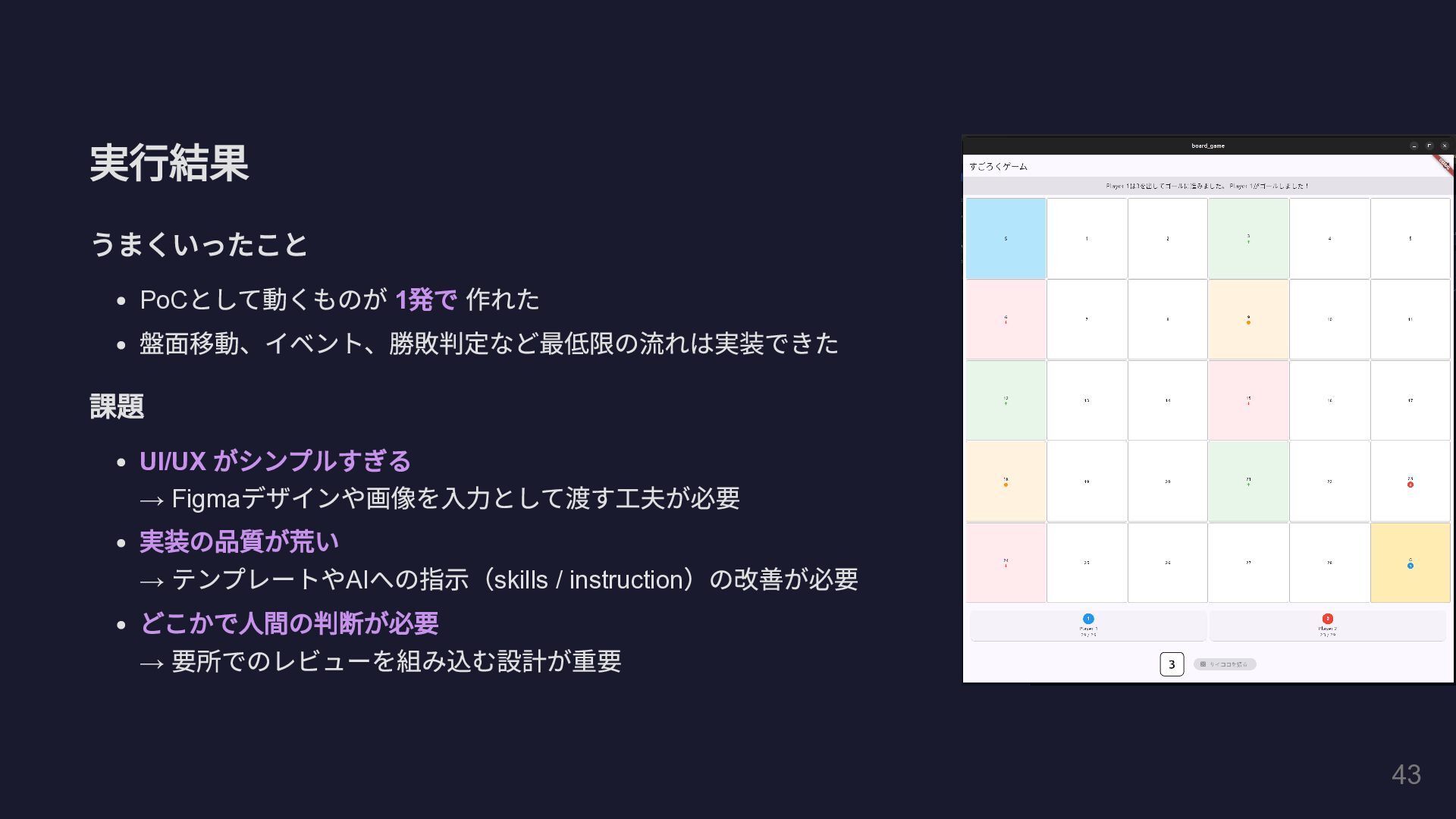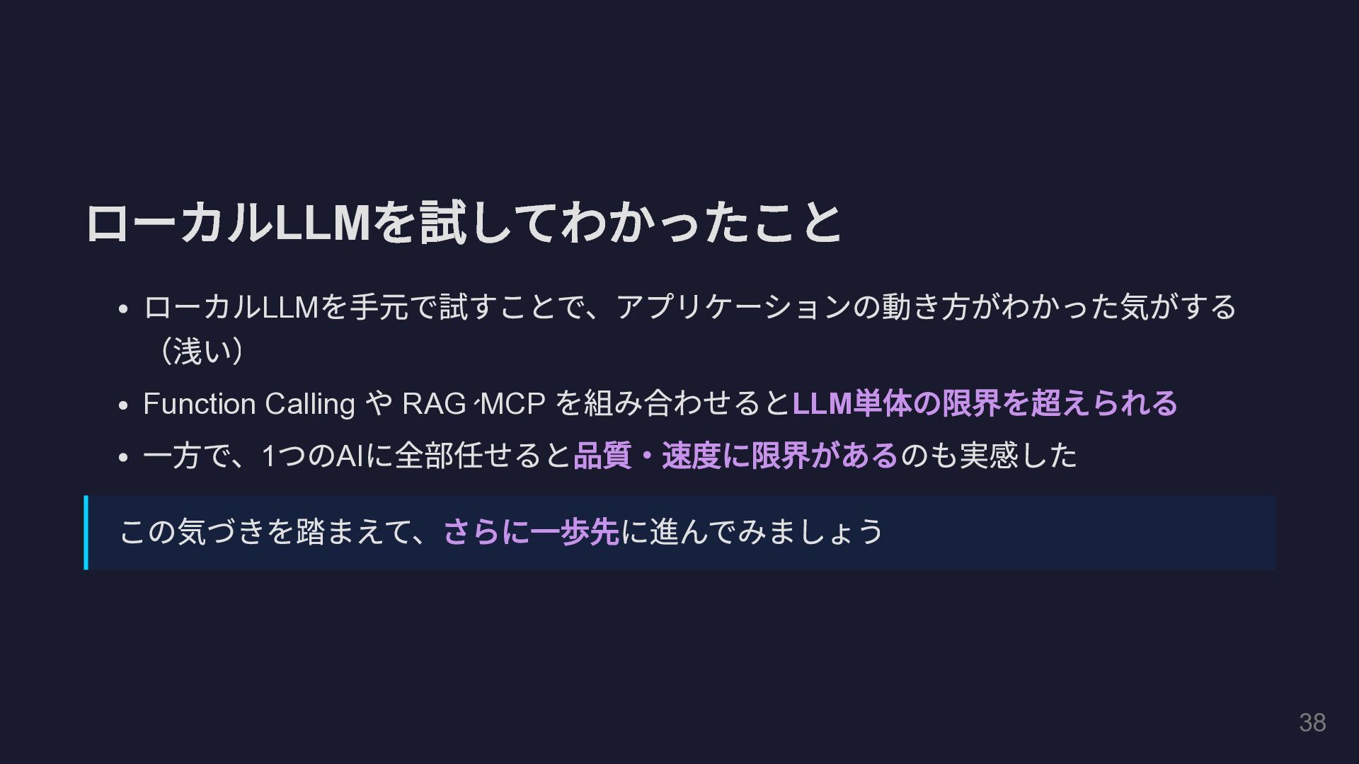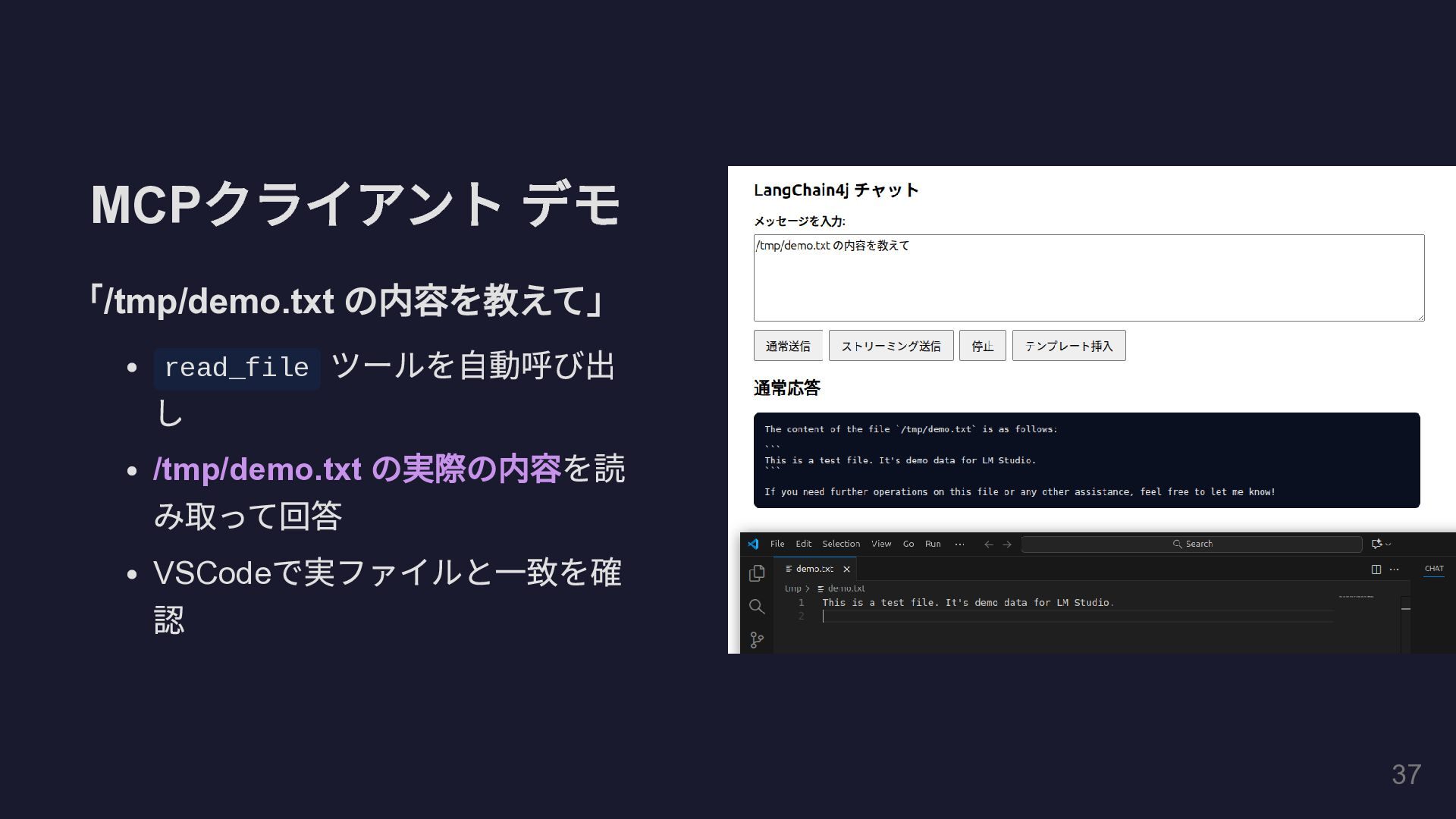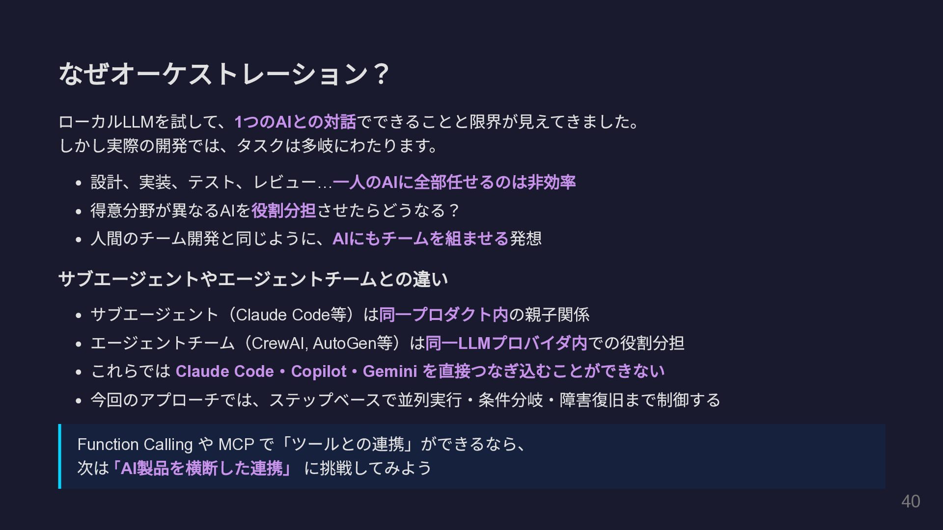 @Tool(""" GitHub Pull Request の全体コメントと インラインコメントの両方を取得して一覧表示します。 """) public String fetchAllPrComments( @P(" リポジトリのオーナー名") String owner, @P(" リポジトリ名") String repo, @P("PR 番号") int prNumber) { // GitHub REST API を HttpClient で直接呼び出し String issueComments = callGitHubApi( "/repos/%s/%s/issues/%d/comments" .formatted(owner, repo, prNumber)); String reviewComments = callGitHubApi( "/repos/%s/%s/pulls/%d/comments" .formatted(owner, repo, prNumber)); // ... 結果を整形して返却 } } 29