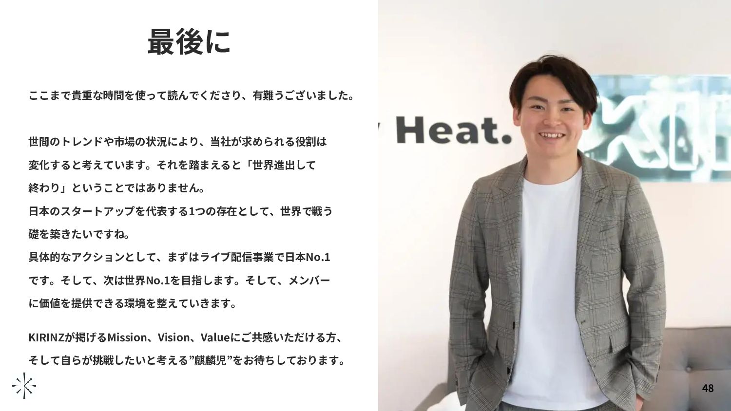 一輝 竹内 壮輔 法政大学に在学中、学生団体の活動から イベント運営事業を立ち上げる。その後、 女子大学生に特化したオーディションイ ベントに事業を拡張し、2016年に株式会 社KIRINZを設立。 Z世代を対象とした集客・育成・マネジ メントを提供価値の一環として、ライバ ー、ナノインフルエンサーのコミュニテ ィ形成を促進。 現在ではオンラインイベント事業で形成 した大学生やナノインフルエンサーのコ ミュニティを基盤としたメディアブラン ド事業、マーケティング事業も展開し、 ライブ配信に携わる企業としては他社と 一線を画す。 2006年に株式会社ネットマーケティング (東証一部)に入社し、WEB広告代理業 務に従事。その後、SBIマーケティング 株式会社(現:株式会社カラック)を経 て合同会社DMM.com(旧:株式会社 DMM.comラボ)に入社。 マーケティング本部 本部長に就任。 2019年9月に株式会社グローバンスの執 行役員CMOに就任、2021年3月に同社を 退社。2019年より株式会社KIRINZにジ ョインし、取締役COOを務める。 2007年に株式会社インテリジェンス(現 パーソルホールディングス)にて求人広 告営業に従事。 その後、 株式会社VOYAGEGROUP(現 CARTAHoldings)で経理・財務・IPO準 備・ベンチャー投資・M&Aに携わり、 2017年以降、株式会社キャスターや Activ8株式会社にて取締役CFO等を務め、 管理部セットアップ・資金調達・上場準 備・中国JV設立などを経て、2021年8月 より株式会社KIRINZの取締役CFOに就任。 経営メンバー