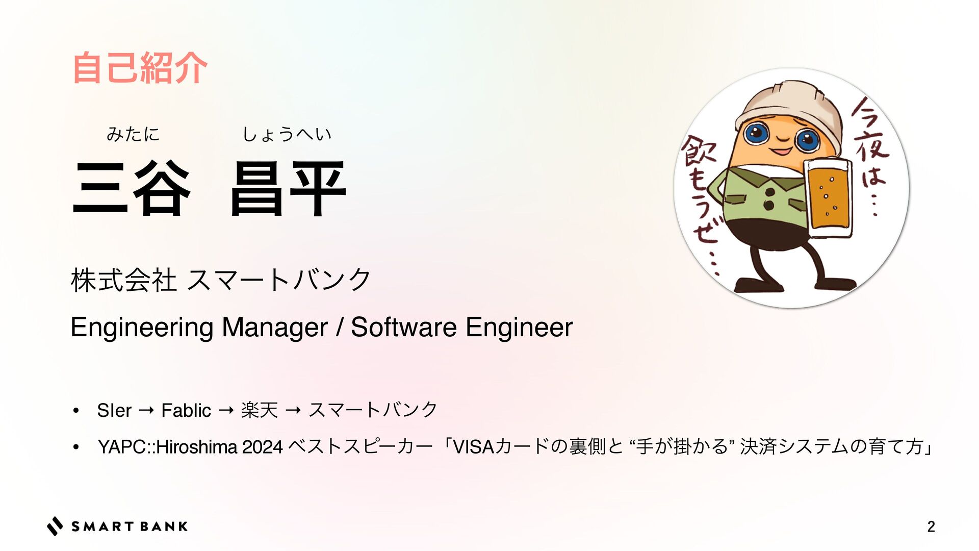 • YAPC::Hiroshima 2024 ϕετεϐʔΧʔʮVISAΧʔυͷཪଆͱ “खֻ͕͔Δ” ܾࡁγεςϜͷҭͯํʯ ࡾ୩ ণฏ Έͨʹ ͠ΐ͏΁͍ גࣜձࣾ εϚʔτόϯΫ Engineering Manager / Software Engineer