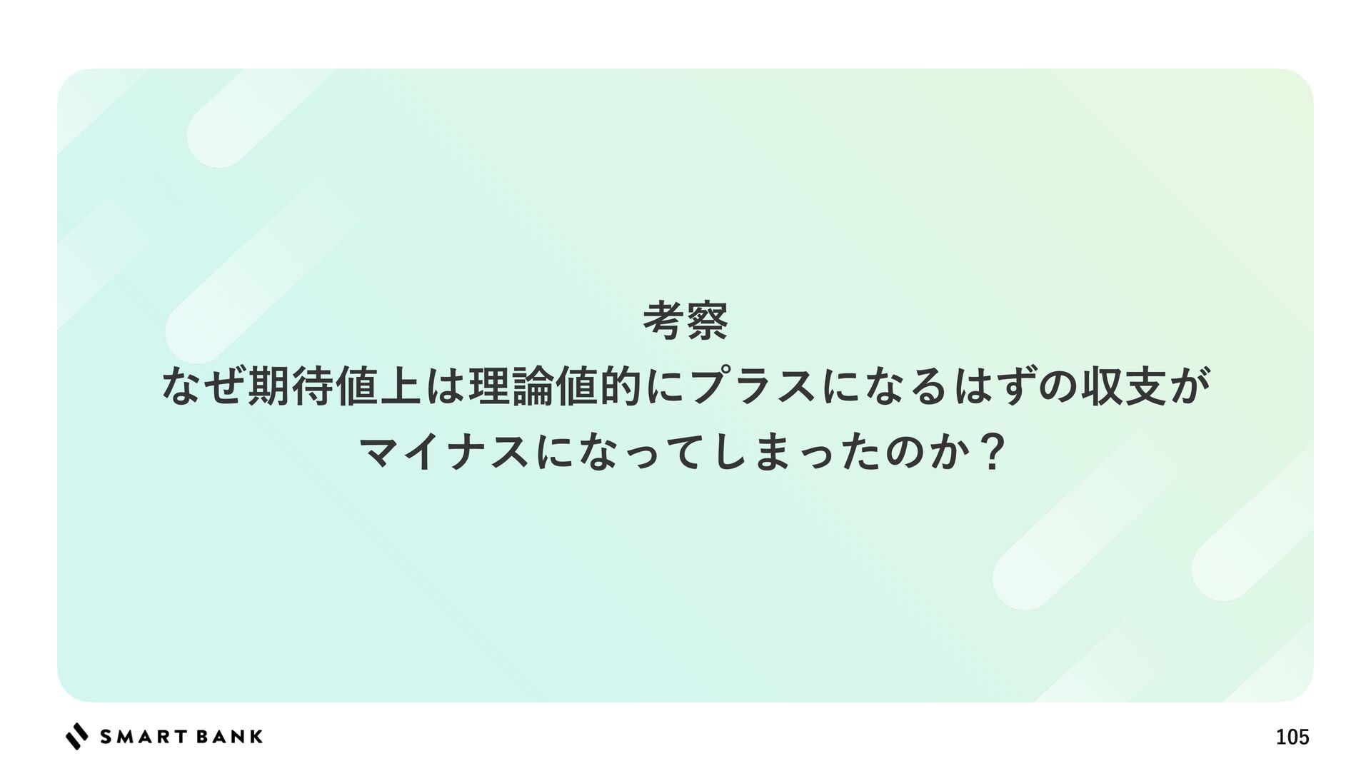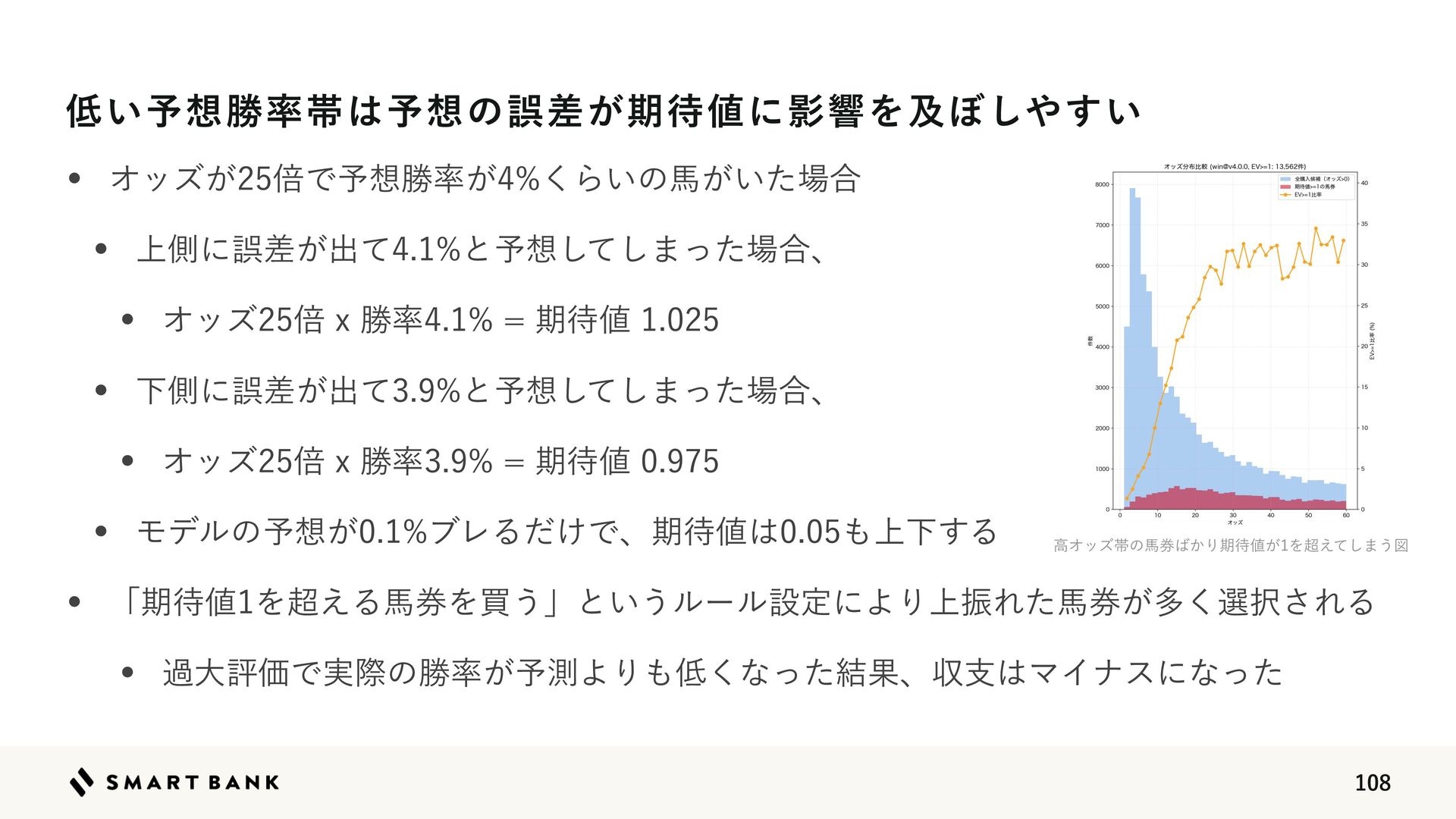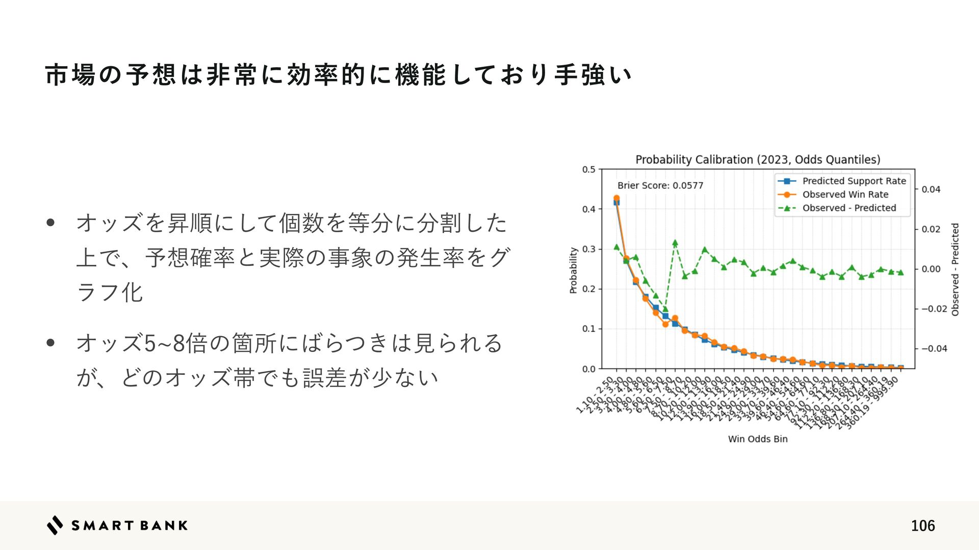 ΦοζഒYউ཰ظ଴஋ w Ϟσϧͷ༧૝͕ϒϨΔ͚ͩͰɺظ଴஋͸΋্Լ͢Δ w ʮظ଴஋Λ௒͑Δഅ݊Λങ͏ʯͱ͍͏ϧʔϧઃఆʹΑΓ্ৼΕͨഅ͕݊ଟ͘બ୒͞ΕΔ w աେධՁͰ࣮ࡍͷউ཰͕༧ଌΑΓ΋௿͘ͳͬͨ݁Ռɺऩࢧ͸ϚΠφεʹͳͬͨ ௿͍༧૝উ཰ଳ͸༧૝ͷޡ͕ࠩظ଴஋ʹӨڹΛٴ΅͠΍͍͢ ߴΦοζଳͷഅ݊͹͔Γظ଴஋͕Λ௒͑ͯ͠·͏ਤ