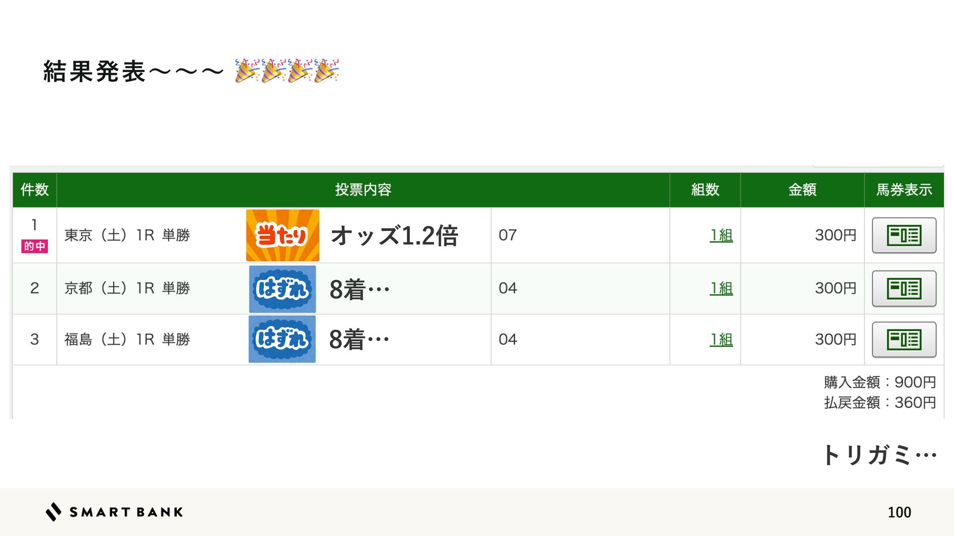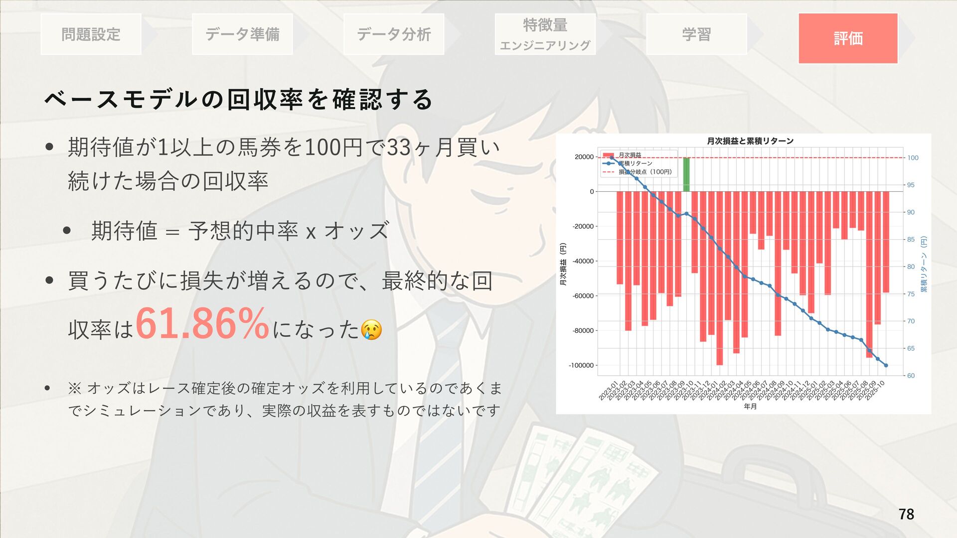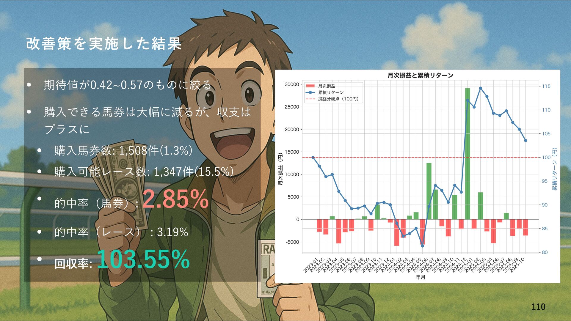 ΦοζഒYউ཰ظ଴஋ w Ϟσϧͷ༧૝͕ϒϨΔ͚ͩͰɺظ଴஋͸΋্Լ͢Δ w ʮظ଴஋Λ௒͑Δഅ݊Λങ͏ʯͱ͍͏ϧʔϧઃఆʹΑΓ্ৼΕͨഅ͕݊ଟ͘બ୒͞ΕΔ w աେධՁͰ࣮ࡍͷউ཰͕༧ଌΑΓ΋௿͘ͳͬͨ݁Ռɺऩࢧ͸ϚΠφεʹͳͬͨ ௿͍༧૝উ཰ଳ͸༧૝ͷޡ͕ࠩظ଴஋ʹӨڹΛٴ΅͠΍͍͢ ߴΦοζଳͷഅ݊͹͔Γظ଴஋͕Λ௒͑ͯ͠·͏ਤ