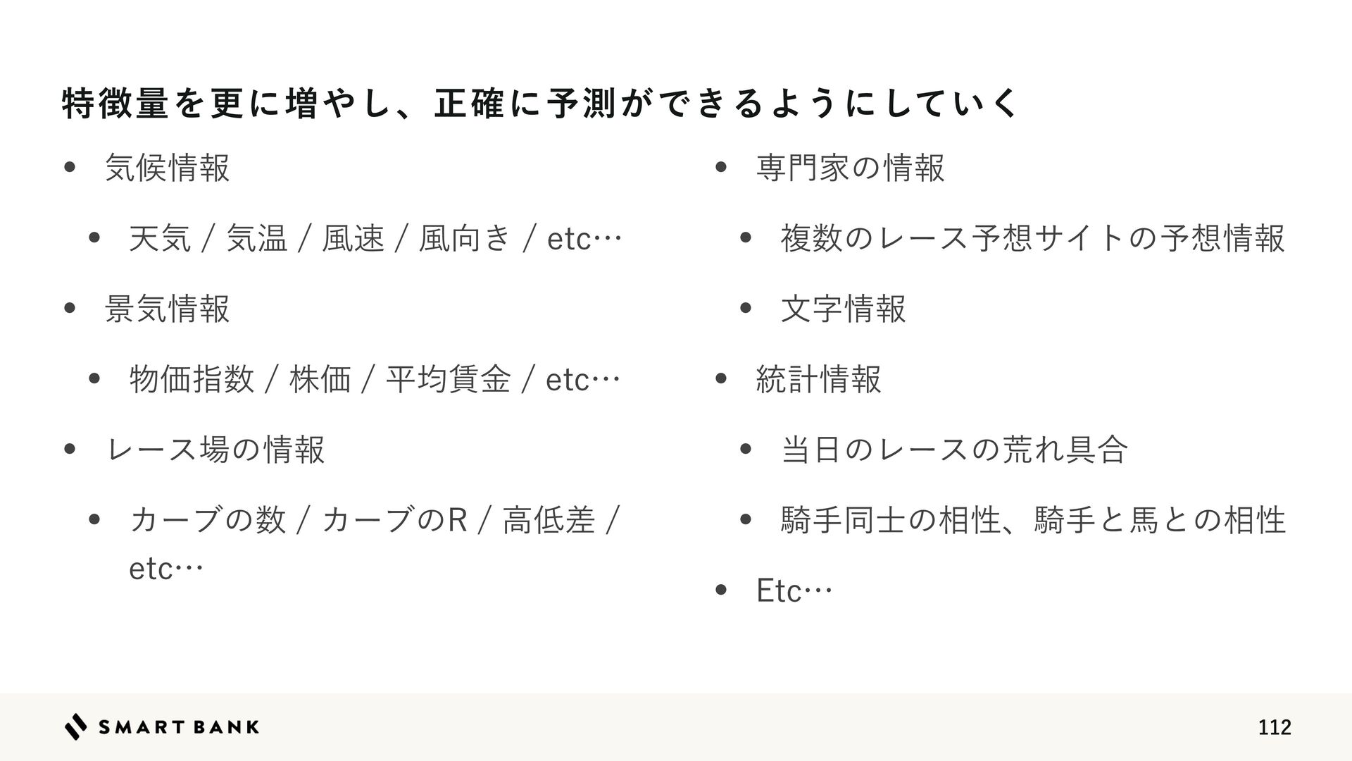 w Ϩʔε৔ͷ৘ใ w Χʔϒͷ਺Χʔϒͷ3ߴ௿ࠩ FUDʜ w ઐ໳Ոͷ৘ใ w ෳ਺ͷϨʔε༧૝αΠτͷ༧૝৘ใ w จࣈ৘ใ w ౷ܭ৘ใ w ౰೔ͷϨʔεͷߥΕ۩߹ w ٍखಉ࢜ͷ૬ੑɺٍखͱഅͱͷ૬ੑ w &UDʜ