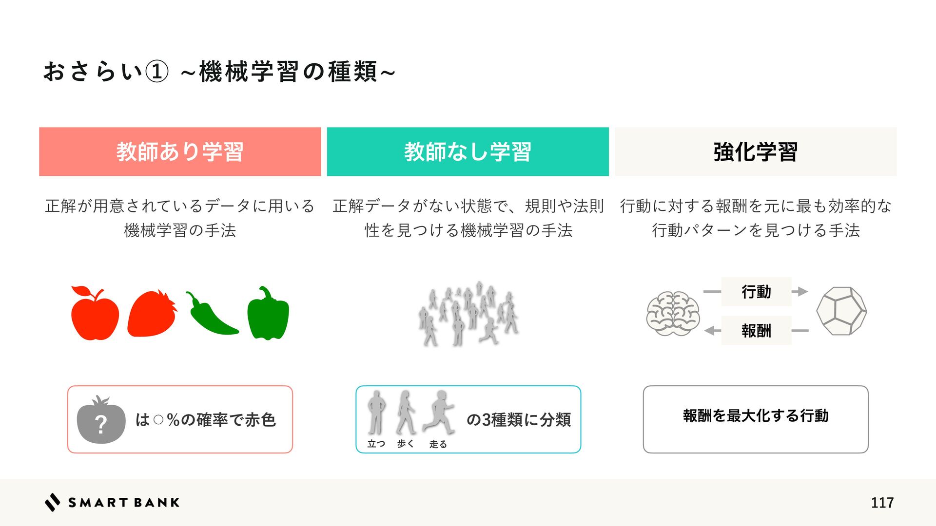 52.  ͓͞Β͍ᶃdػցֶशͷछྨd ڭࢣ͋Γֶश ڭࢣͳֶ͠श ڧԽֶश ਖ਼ղ͕༻ҙ͞Ε͍ͯΔσʔλʹ༻͍Δ ػցֶशͷख๏ ͸ ⚪︎ ͷ֬཰Ͱ੺৭