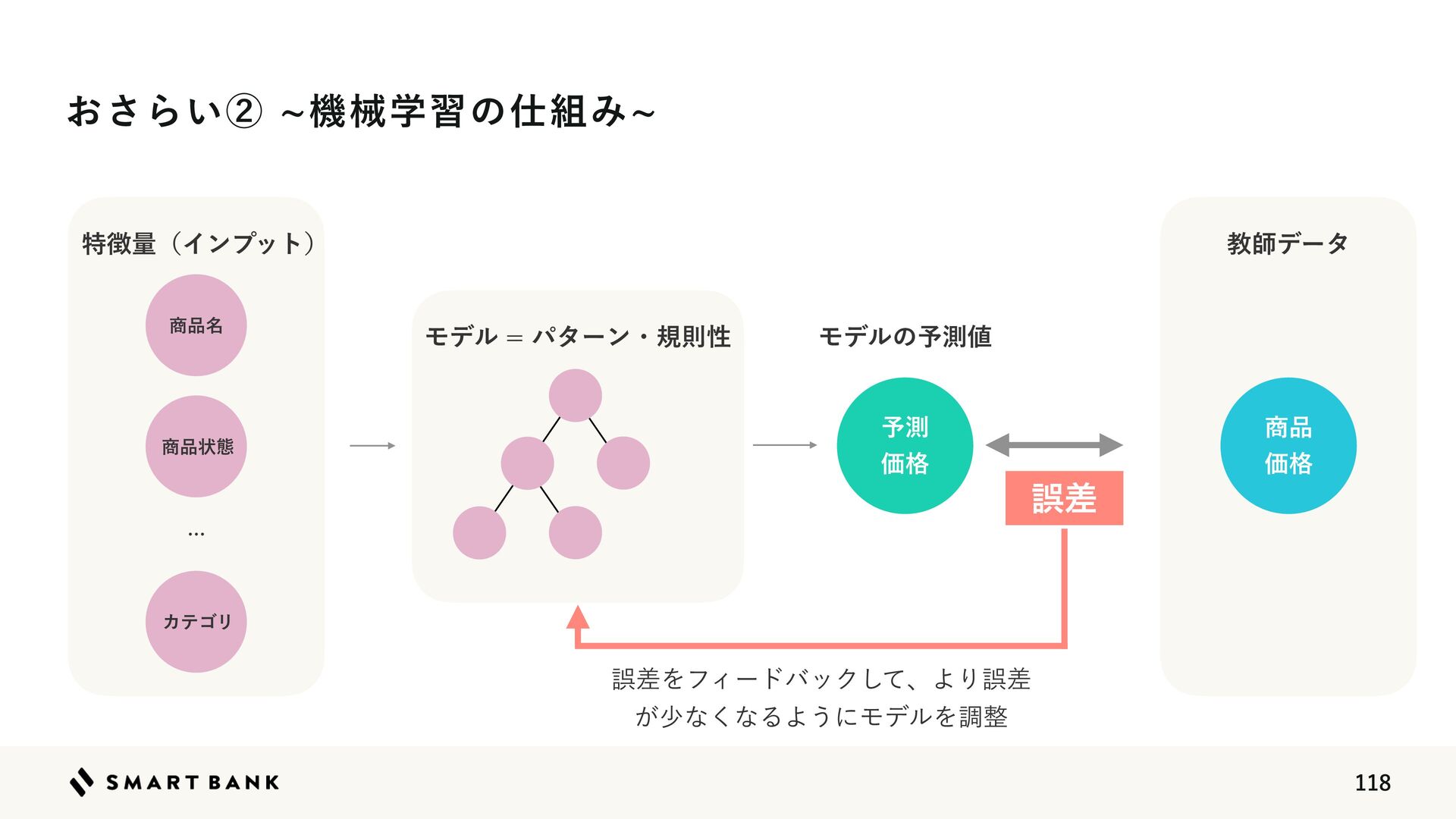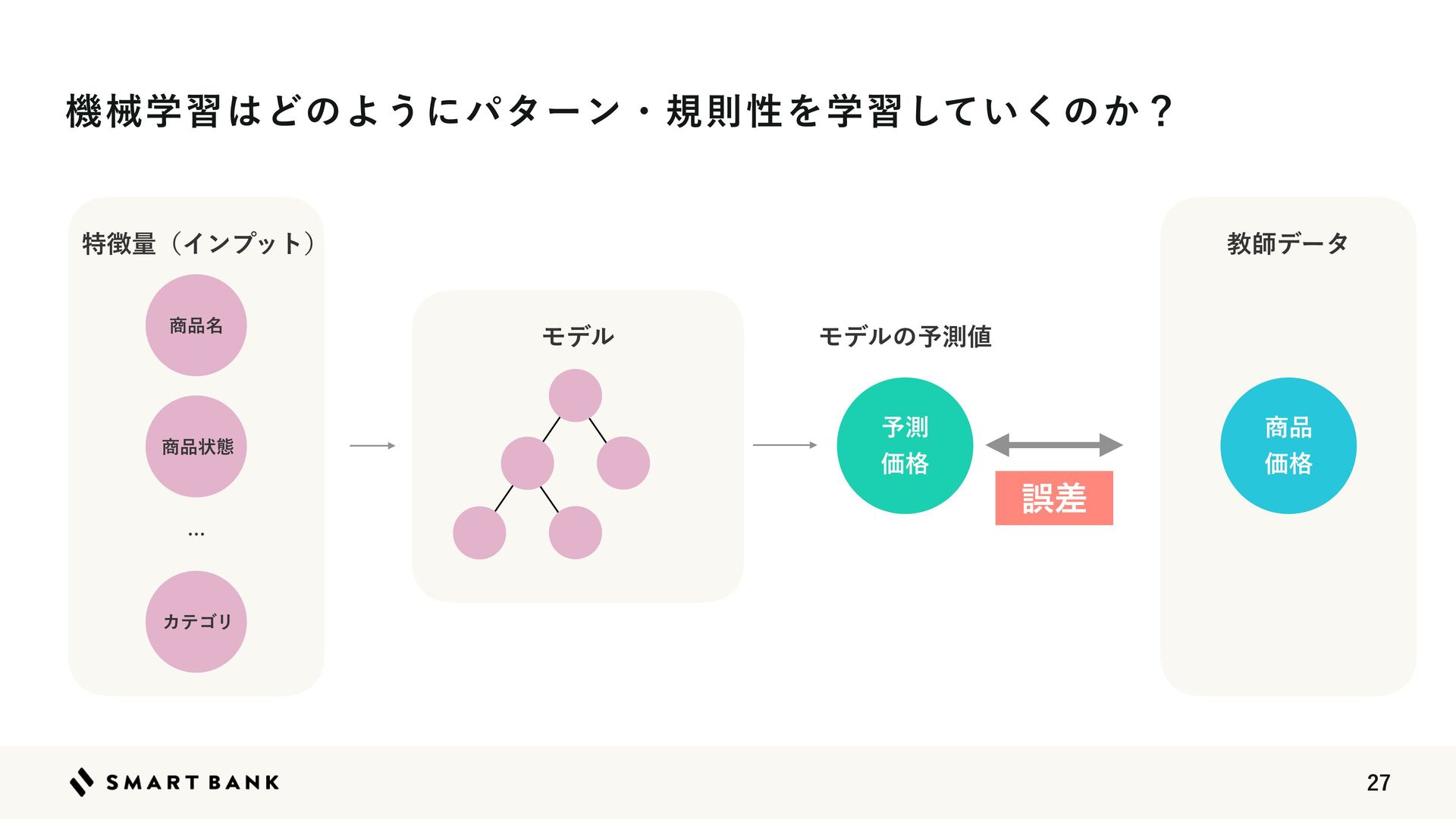 Δ΋ͷΛʮ໨తؔ਺ʯͱ͍͏ ঎඼໊ ΧςΰϦ ঎඼ Ձ֨ ঎඼ঢ়ଶ Ϟσϧ ػցֶश͸ͲͷΑ͏ʹύλʔϯɾنଇੑΛֶश͍ͯ͘͠ͷ͔ʁ ޡࠩ