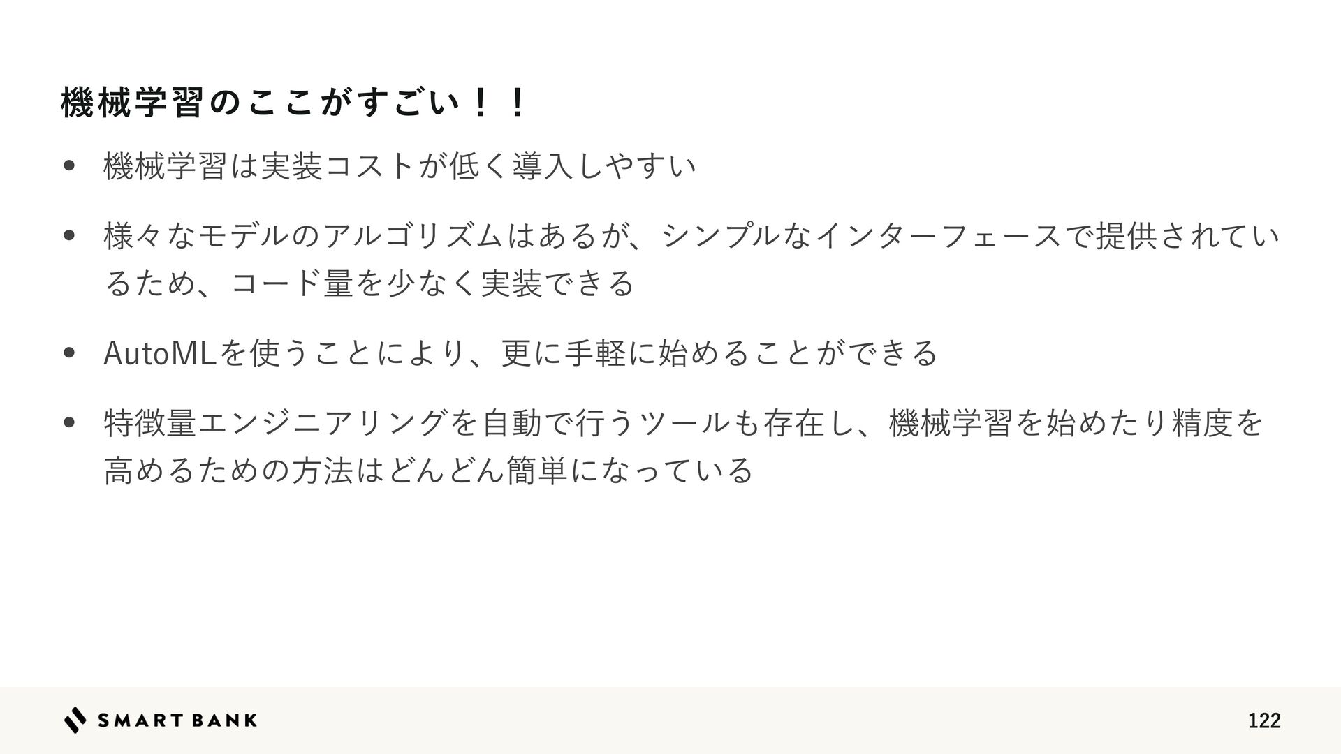 w େن໛ͳσʔληοτͰ΋ߴ଎ʹֶशͰ͖Δ w /6--͕ͦͷ··ѻ͑ͨΓɺΧςΰϦม਺Λͦͷ··౉ͤͨΓ࢖͍΍͍͢ w ,BHHMFͰ΋ਓؾ ֶश ໰୊ઃఆ ධՁ σʔλ४උ σʔλ෼ੳ ಛ௃ྔ ΤϯδχΞϦϯά Ҿ༻IUUQTMJHIUHCNSFBEUIFEPDTJPFOMBUFTU'FBUVSFTIUNM