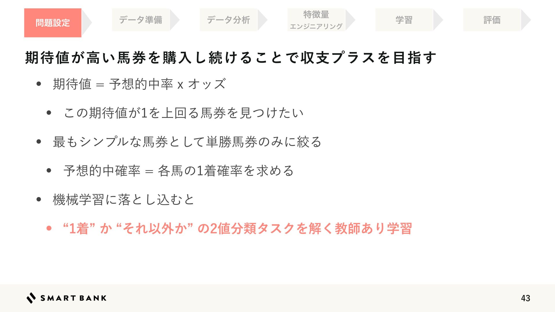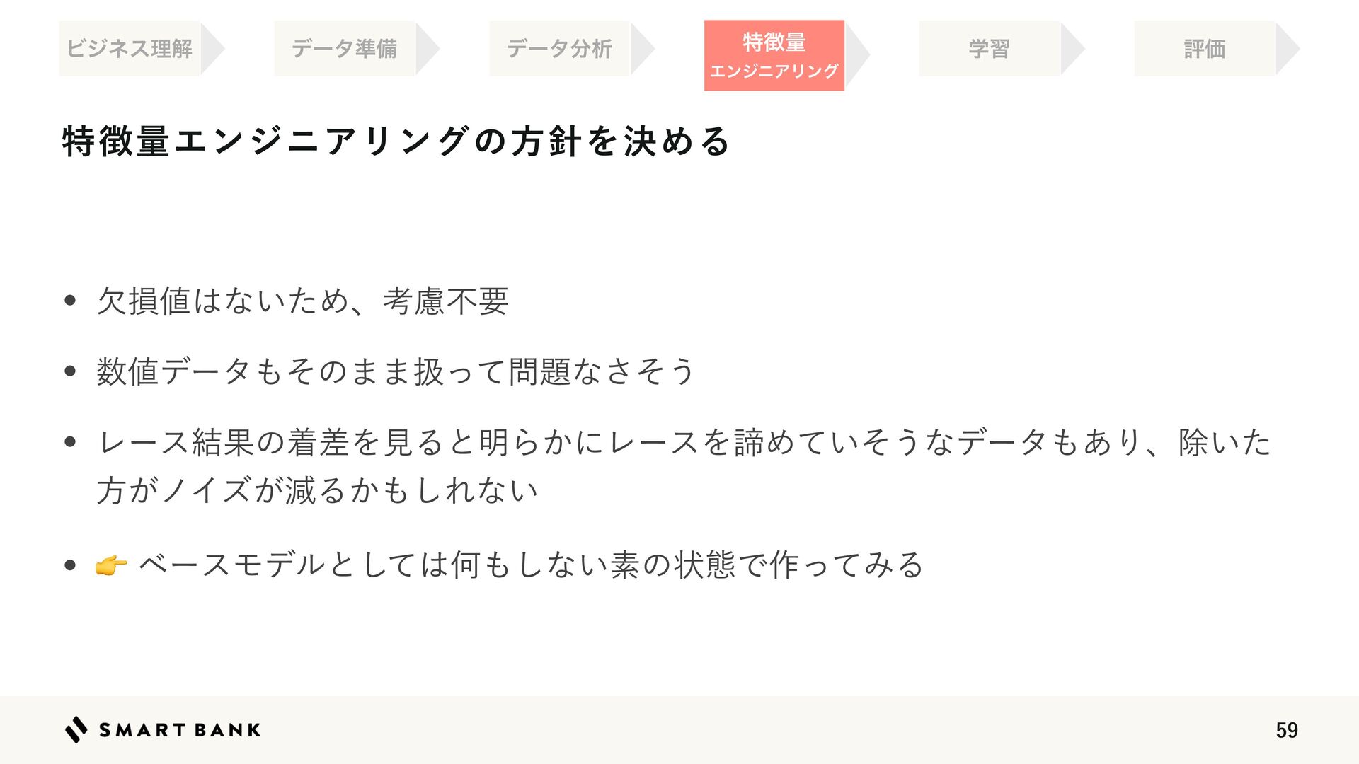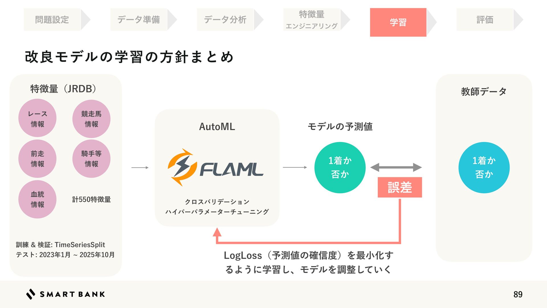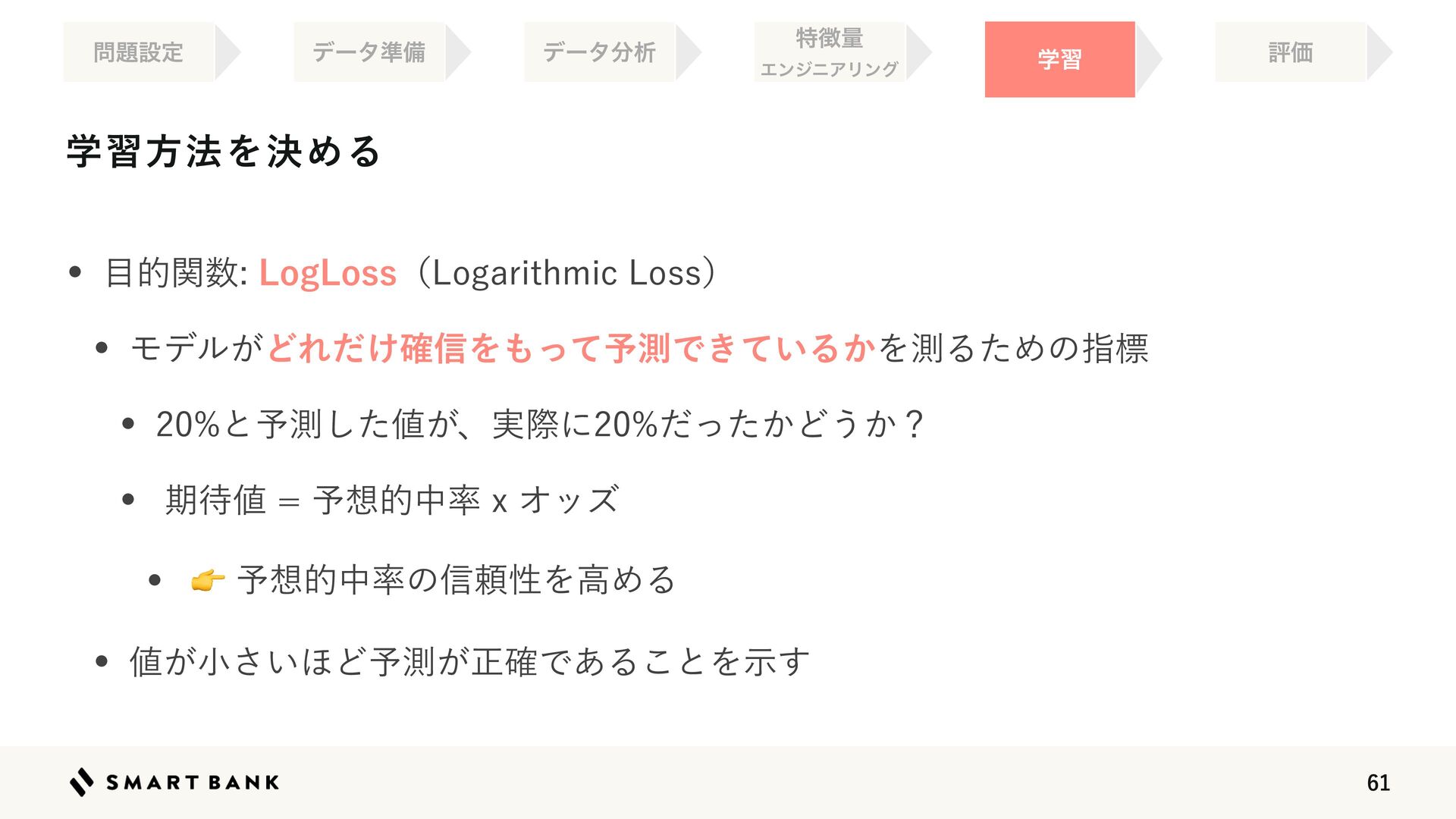 w 👉༧૝తத཰ͷ৴པੑΛߴΊΔ w ஋͕খ͍͞΄Ͳ༧ଌ͕ਖ਼֬Ͱ͋Δ͜ͱΛࣔ͢ ֶश ໰୊ઃఆ ධՁ σʔλ४උ σʔλ෼ੳ ಛ௃ྔ ΤϯδχΞϦϯά