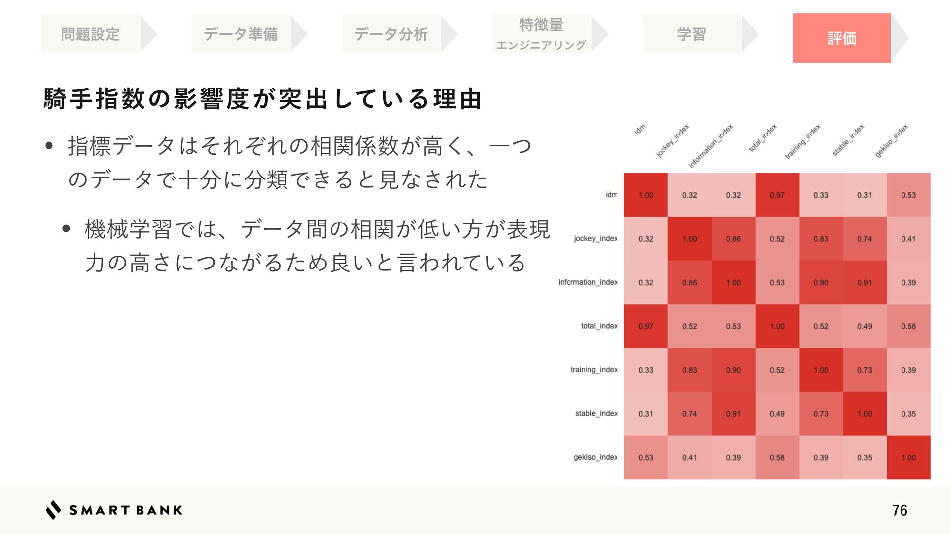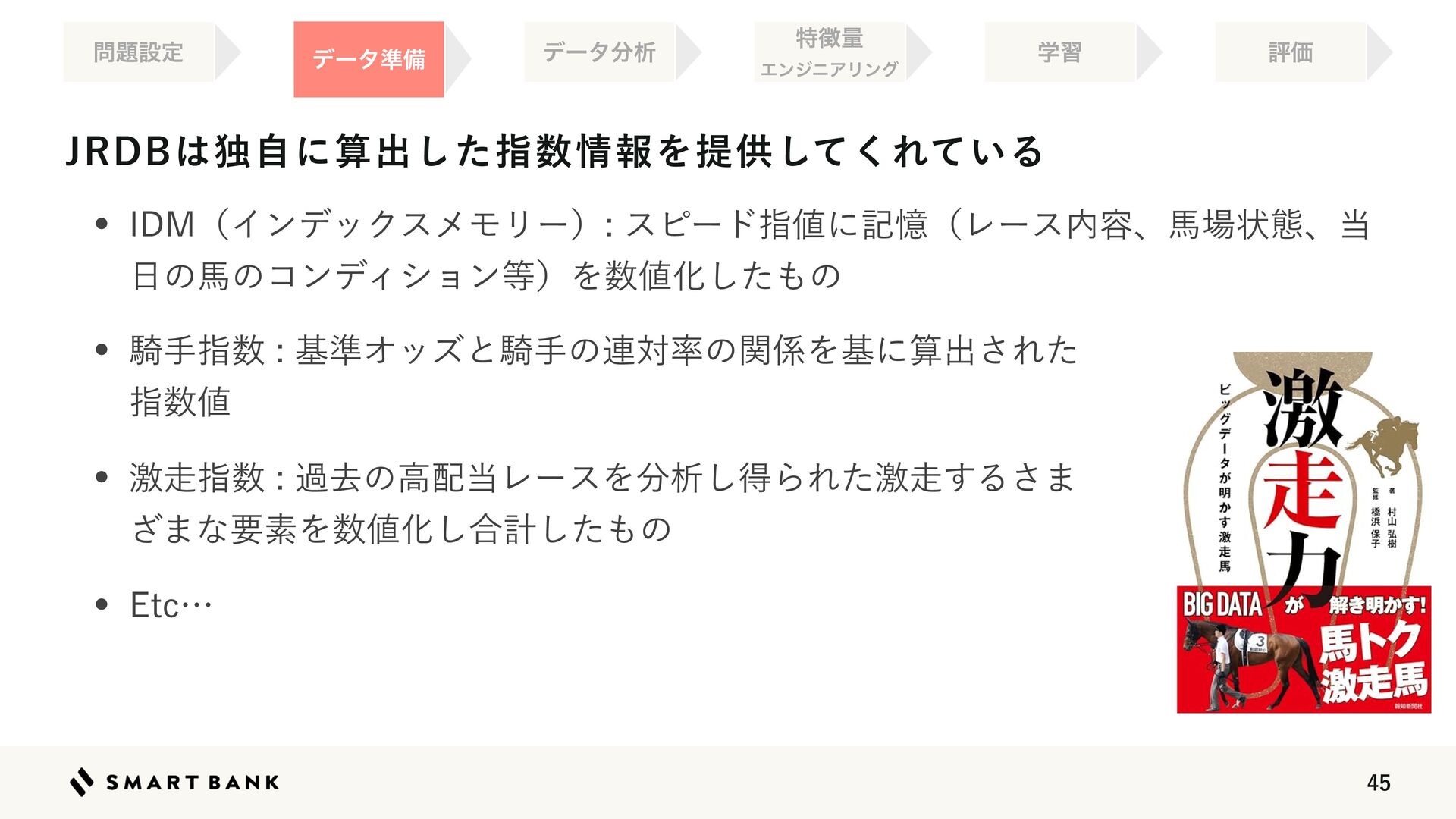 w *%.ʢΠϯσοΫεϝϞϦʔʣεϐʔυࢦ஋ʹهԱʢϨʔε಺༰ɺഅ৔ঢ়ଶɺ౰ ೔ͷഅͷίϯσΟγϣϯ౳ʣΛ਺஋Խͨ͠΋ͷ ಛ௃ྔ ΤϯδχΞϦϯά ໰୊ઃఆ ֶश ධՁ σʔλ४උ σʔλ෼ੳ