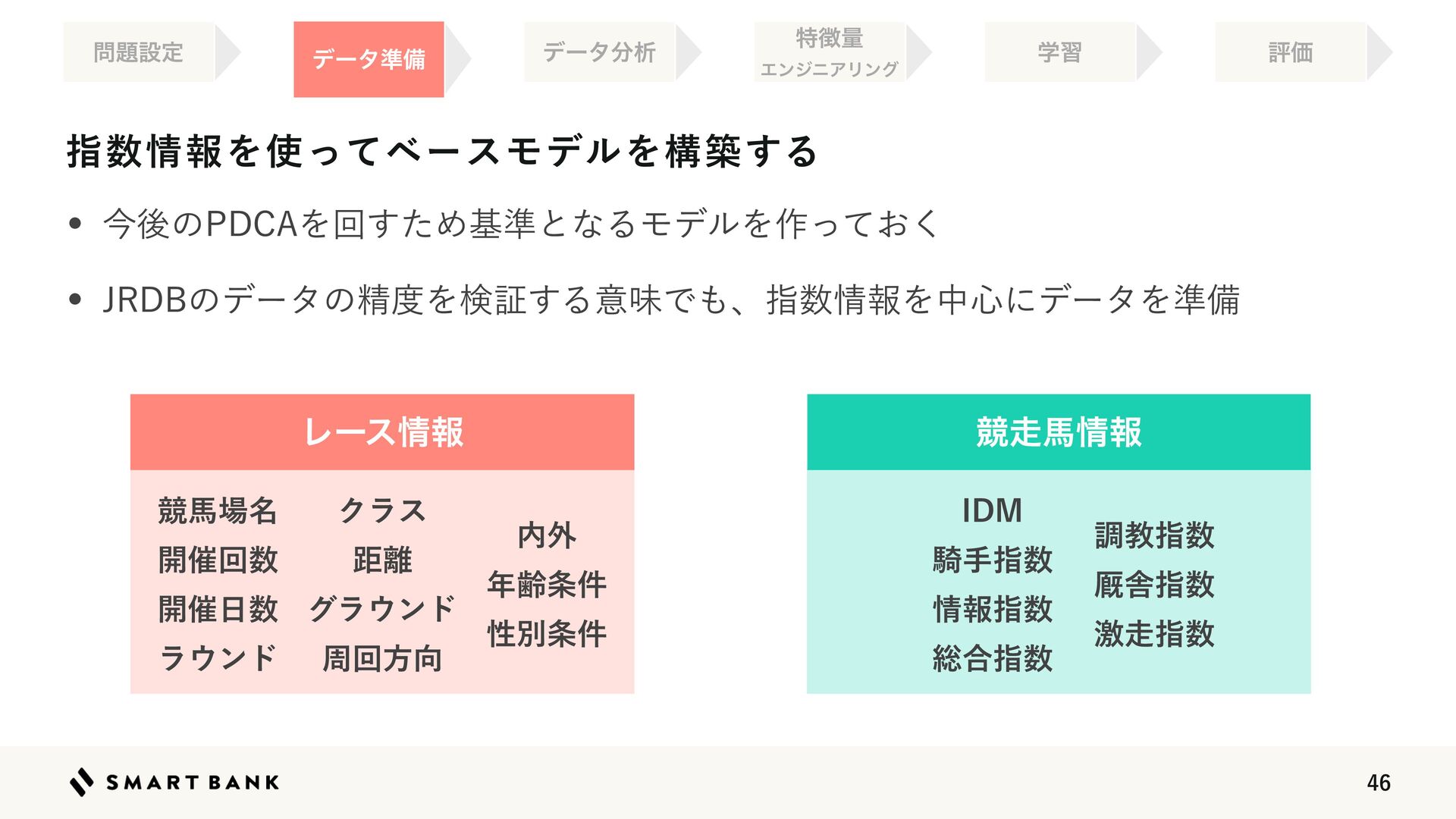 13.  ࢦ਺৘ใΛ࢖ͬͯϕʔεϞσϧΛߏங͢Δ w ࠓޙͷ1%$"Λճͨ͢Ίج४ͱͳΔϞσϧΛ࡞͓ͬͯ͘ w +3%#ͷσʔλͷਫ਼౓Λݕূ͢ΔҙຯͰ΋ɺࢦ਺৘ใΛத৺ʹσʔλΛ४උ ಛ௃ྔ ΤϯδχΞϦϯά ໰୊ઃఆ ֶश