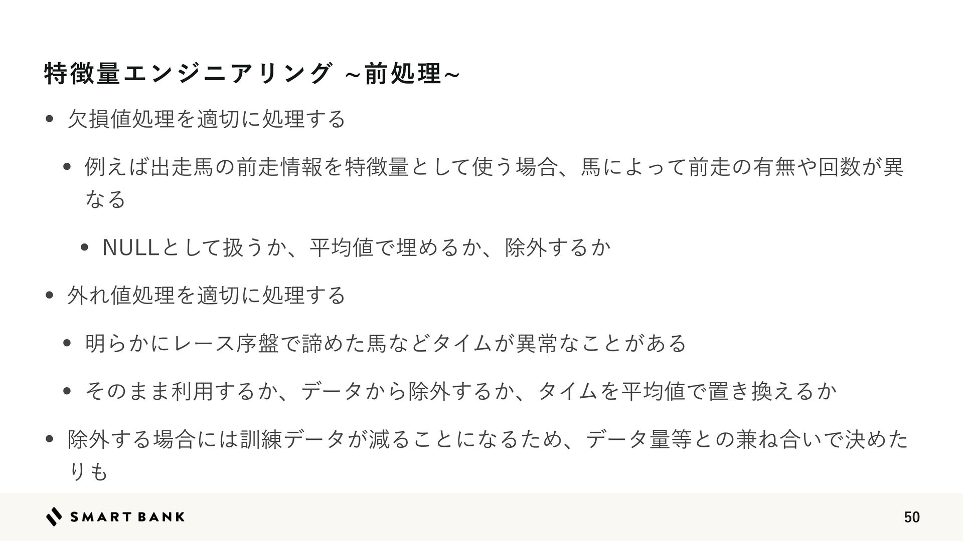 ֎Ε஋ॲཧΛద੾ʹॲཧ͢Δ w ໌Β͔ʹϨʔεং൫ͰఘΊͨഅͳͲλΠϜ͕ҟৗͳ͜ͱ͕͋Δ w ͦͷ··ར༻͢Δ͔ɺσʔλ͔Βআ֎͢Δ͔ɺλΠϜΛฏۉ஋Ͱஔ͖׵͑Δ͔ w আ֎͢Δ৔߹ʹ͸܇࿅σʔλ͕ݮΔ͜ͱʹͳΔͨΊɺσʔλྔ౳ͱͷ݉Ͷ߹͍ͰܾΊͨ Γ΋