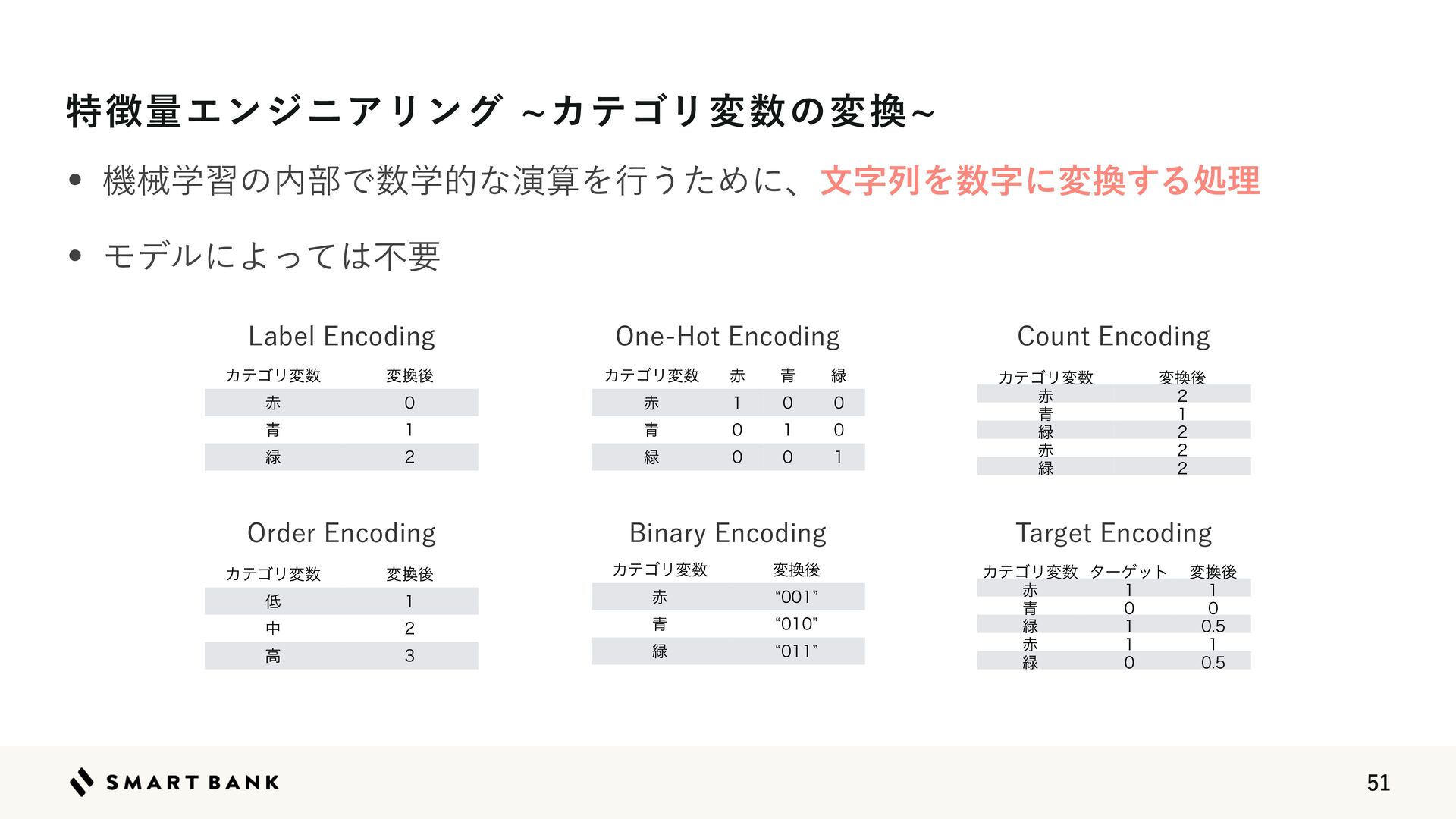 16.  ಛ௃ྔΤϯδχΞϦϯάdΧςΰϦม਺ͷม׵d w ػցֶशͷ಺෦Ͱ਺ֶతͳԋࢉΛߦ͏ͨΊʹɺจࣈྻΛ਺ࣈʹม׵͢Δॲཧ w ϞσϧʹΑͬͯ͸ෆཁ ΧςΰϦม਺ ม׵ޙ ੺