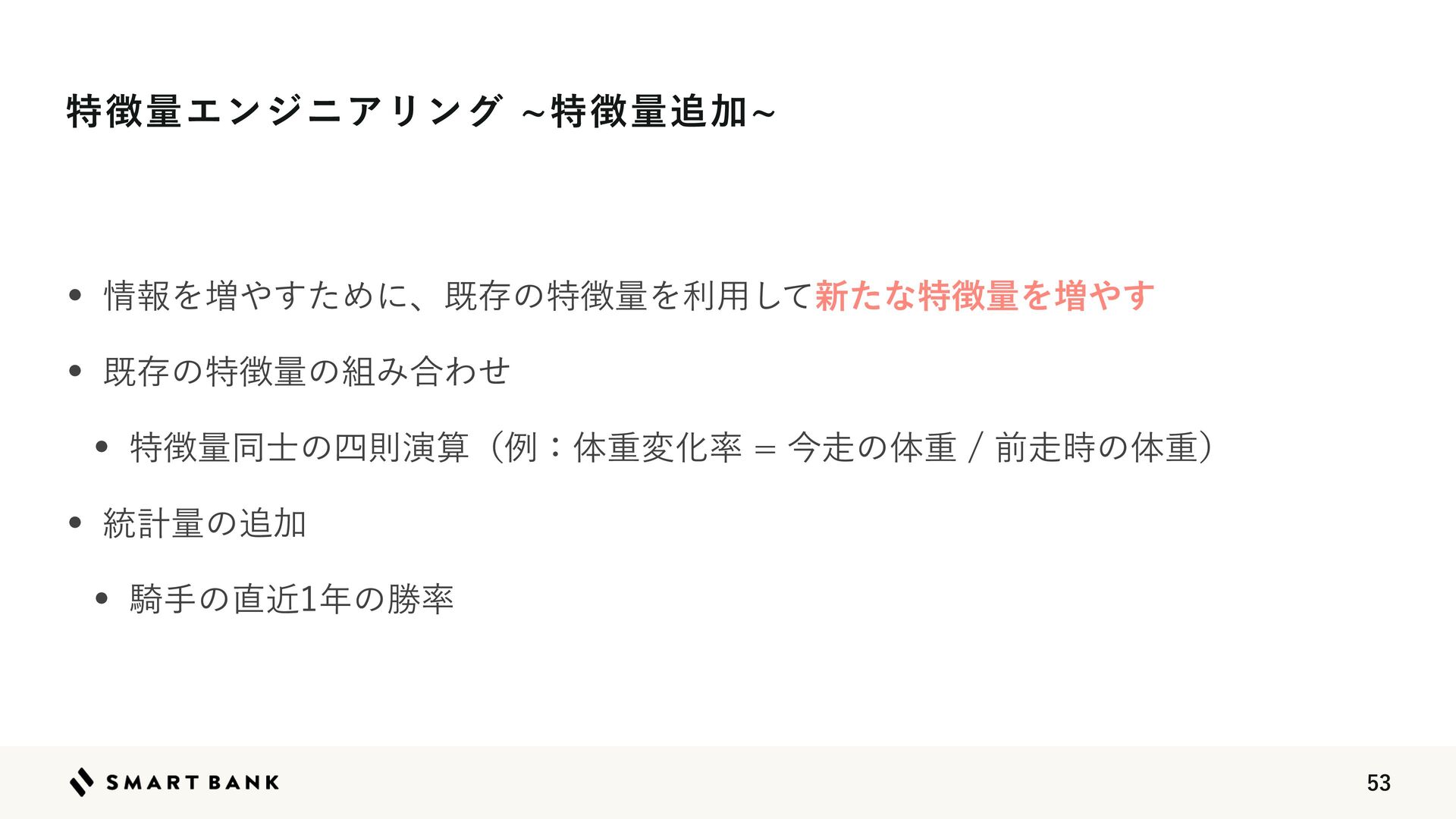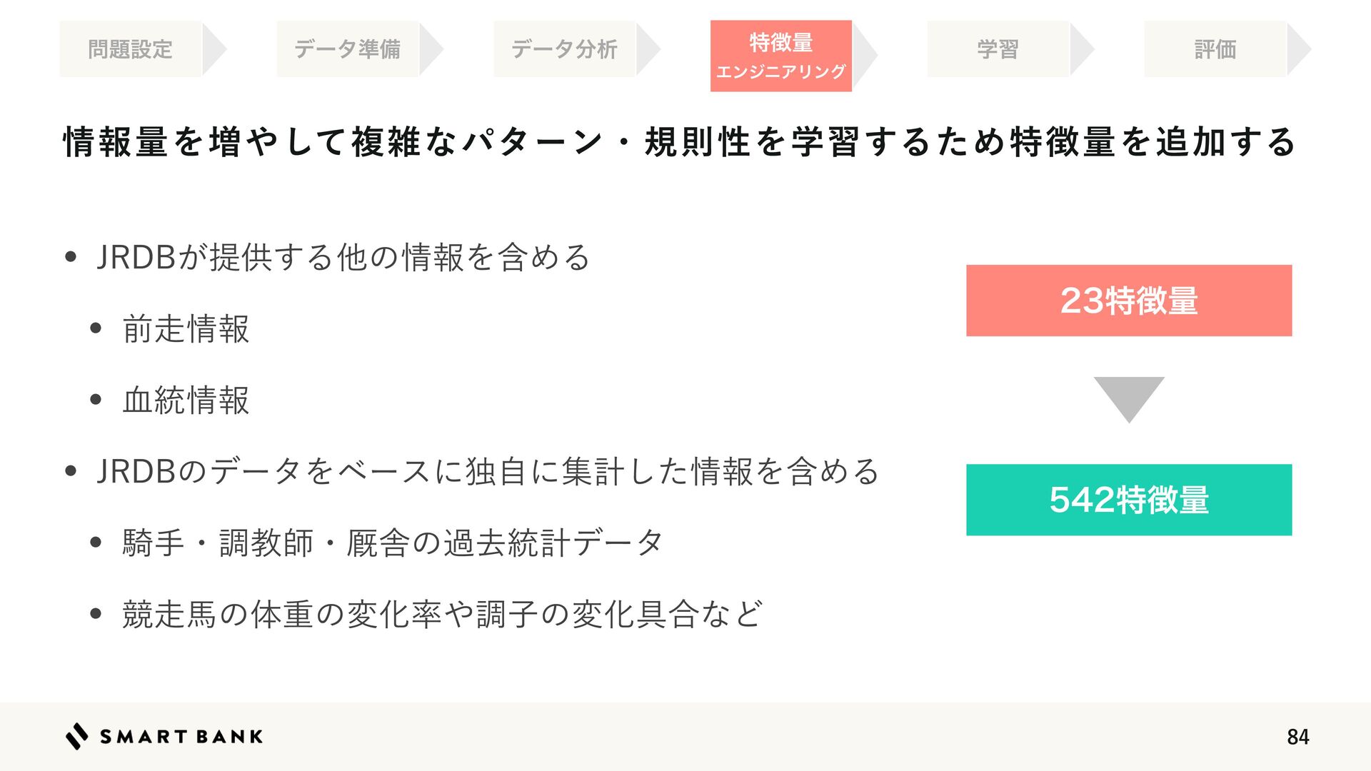 36.  ৘ใྔΛ૿΍ͯ͠ෳࡶͳύλʔϯɾنଇੑΛֶश͢ΔͨΊಛ௃ྔΛ௥Ճ͢Δ w +3%#͕ఏڙ͢Δଞͷ৘ใΛؚΊΔ w લ૸৘ใ w ݂౷৘ใ w +3%#ͷσʔλΛϕʔεʹಠࣗʹूܭͨ͠৘ใΛؚΊΔ