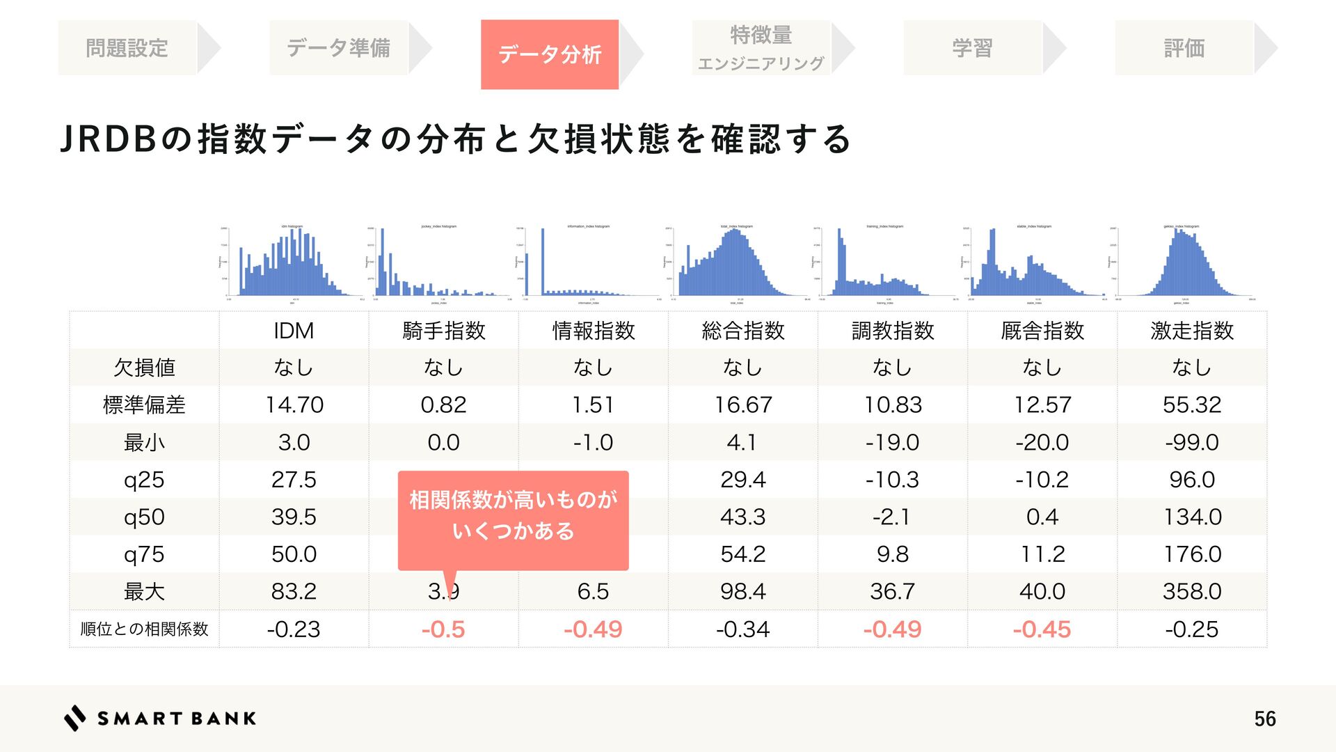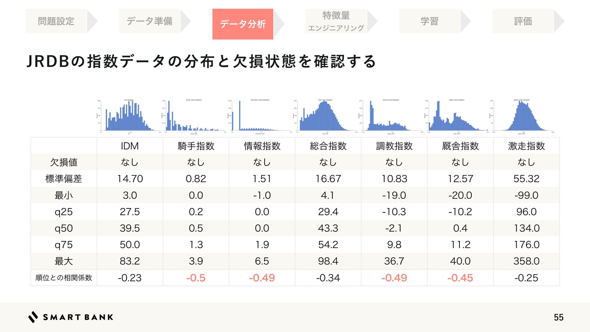 ৘ใࢦ਺ ૯߹ࢦ਺ ௐڭࢦ਺ 伯ࣷࢦ਺ ܹ૸ࢦ਺ ܽଛ஋ ͳ͠ ͳ͠ ͳ͠ ͳ͠ ͳ͠ ͳ͠ ͳ͠ ඪ४ภࠩ        ࠷খ        R        R        R        ࠷େ        ॱҐͱͷ૬ؔ܎਺        ૬ؔ܎਺͕ߴ͍΋ͷ͕ ͍͔ͭ͋͘Δ +3%#ͷࢦ਺σʔλͷ෼෍ͱܽଛঢ়ଶΛ֬ೝ͢Δ