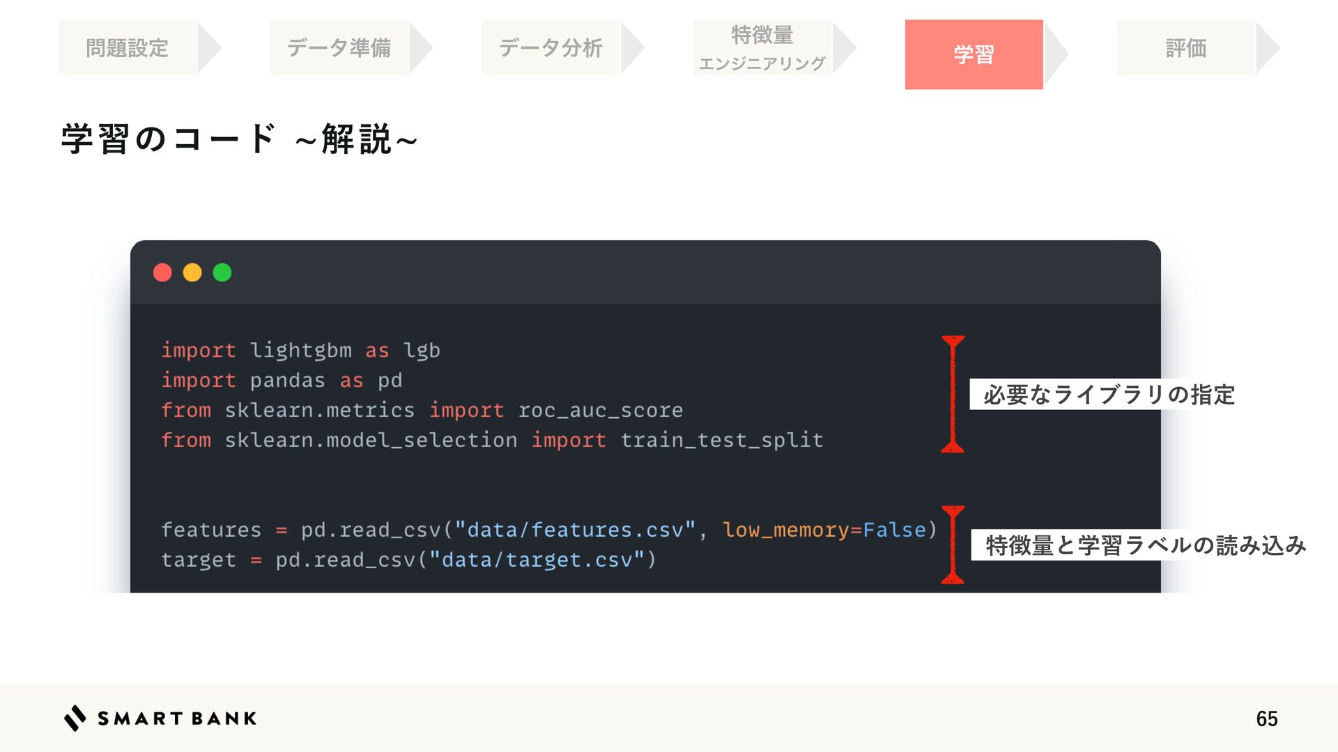 25.  ֶशͷίʔυdղઆd ֶश ໰୊ઃఆ ධՁ σʔλ४උ σʔλ෼ੳ ಛ௃ྔ ΤϯδχΞϦϯά ܇࿅ࡁΈϞσϧͰਪ࿦