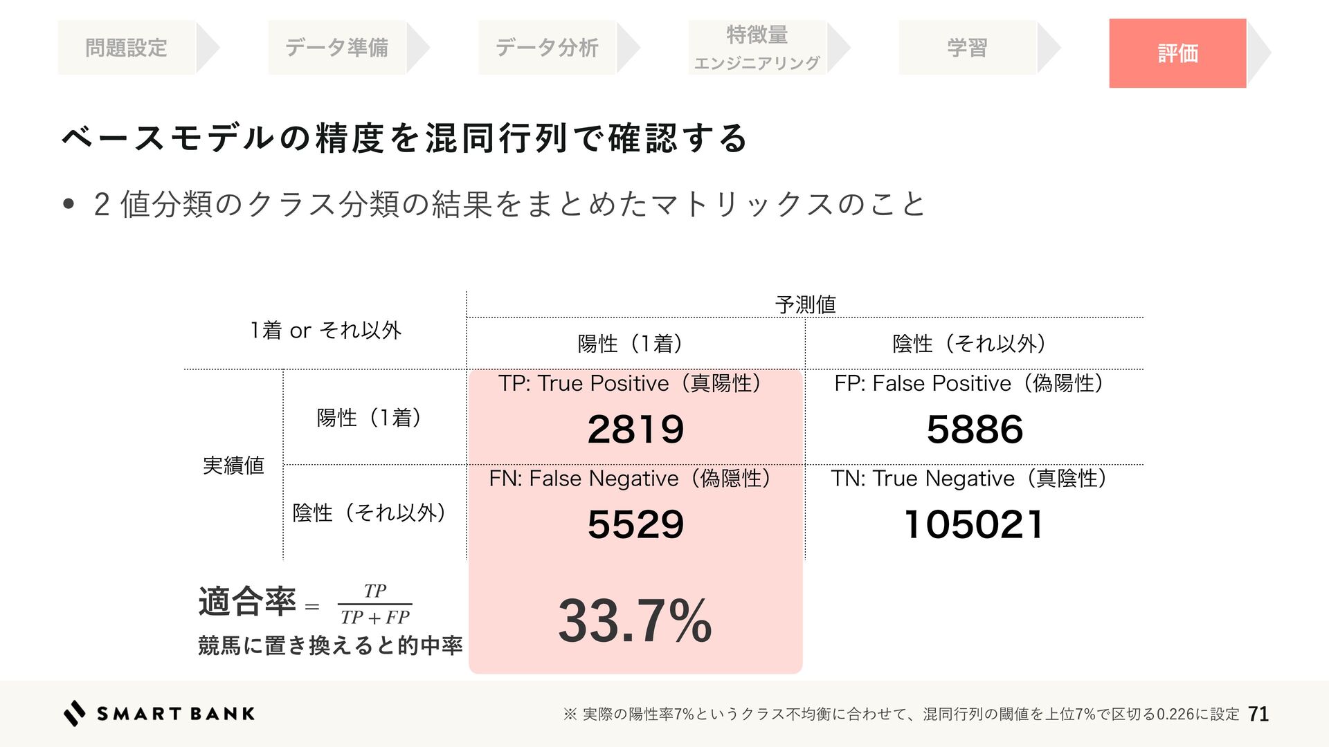 ˞࣮ࡍͷཅੑ཰ͱ͍͏Ϋϥεෆۉߧʹ߹Θͤͯɺࠞಉߦྻͷᮢ஋Λ্ҐͰ۠੾Δʹઃఆ  ద߹཰ ڝഅʹஔ͖׵͑Δͱతத཰ TP TP + FP ணPSͦΕҎ֎ ༧ଌ஋ ཅੑʢணʣ ӄੑʢͦΕҎ֎ʣ ࣮੷஋ ཅੑʢணʣ 515SVF1PTJUJWFʢਅཅੑʣ  '1'BMTF1PTJUJWFʢِཅੑʣ  ӄੑʢͦΕҎ֎ʣ '/'BMTF/FHBUJWFʢِӅੑʣ  5/5SVF/FHBUJWFʢਅӄੑʣ  ϕʔεϞσϧͷਫ਼౓ΛࠞಉߦྻͰ֬ೝ͢Δ