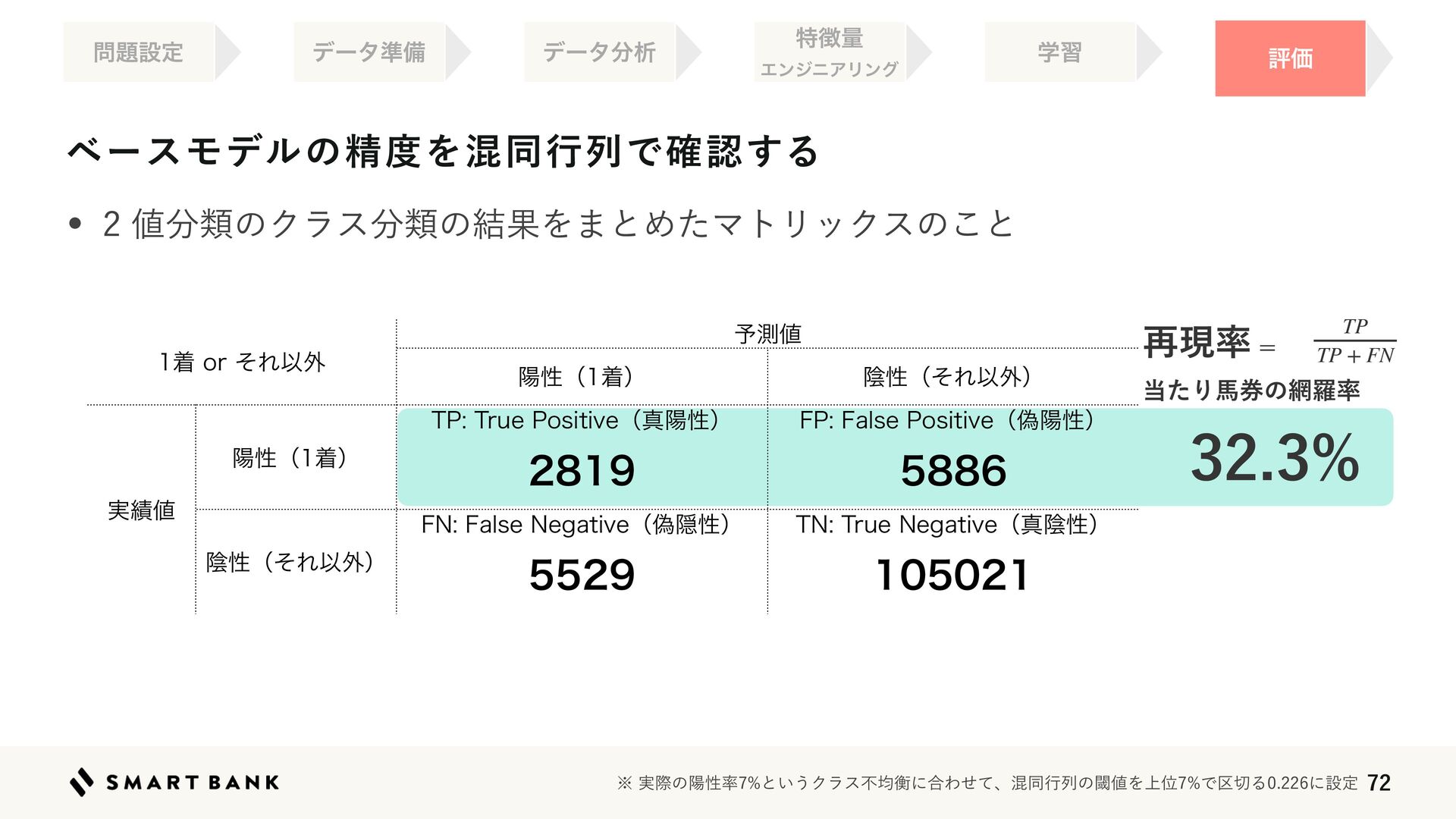 ࠶ݱ཰ ౰ͨΓഅ݊ͷ໢ཏ཰ TP TP + FN  ணPSͦΕҎ֎ ༧ଌ஋ ཅੑʢணʣ ӄੑʢͦΕҎ֎ʣ ࣮੷஋ ཅੑʢணʣ 515SVF1PTJUJWFʢਅཅੑʣ  '1'BMTF1PTJUJWFʢِཅੑʣ  ӄੑʢͦΕҎ֎ʣ '/'BMTF/FHBUJWFʢِӅੑʣ  5/5SVF/FHBUJWFʢਅӄੑʣ  ˞࣮ࡍͷཅੑ཰ͱ͍͏Ϋϥεෆۉߧʹ߹Θͤͯɺࠞಉߦྻͷᮢ஋Λ্ҐͰ۠੾Δʹઃఆ ϕʔεϞσϧͷਫ਼౓ΛࠞಉߦྻͰ֬ೝ͢Δ