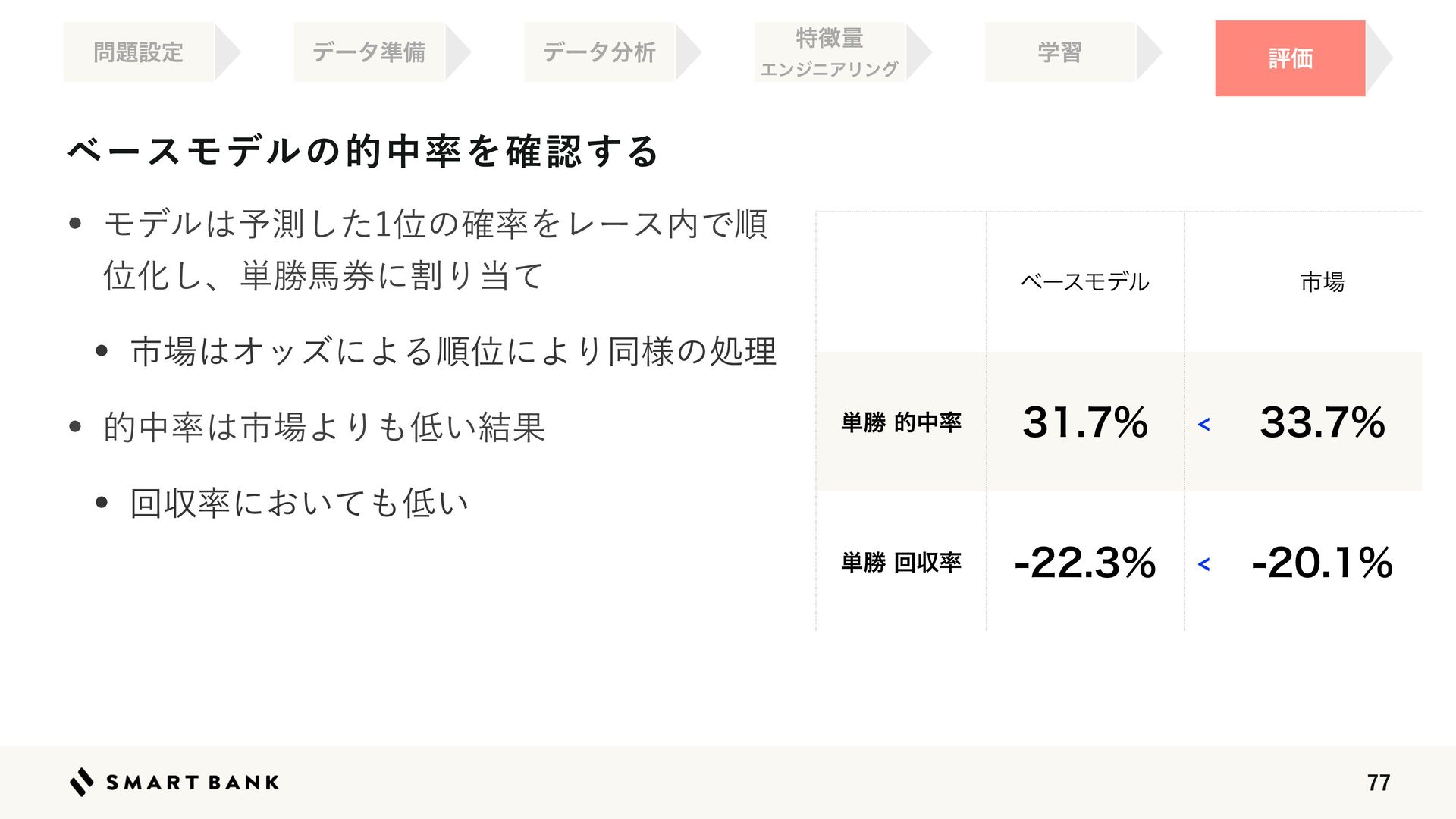 33.  ϕʔεϞσϧͷతத཰Λ֬ೝ͢Δ ධՁ ໰୊ઃఆ σʔλ४උ σʔλ෼ੳ ಛ௃ྔ ΤϯδχΞϦϯά ֶश ϕʔεϞσϧ