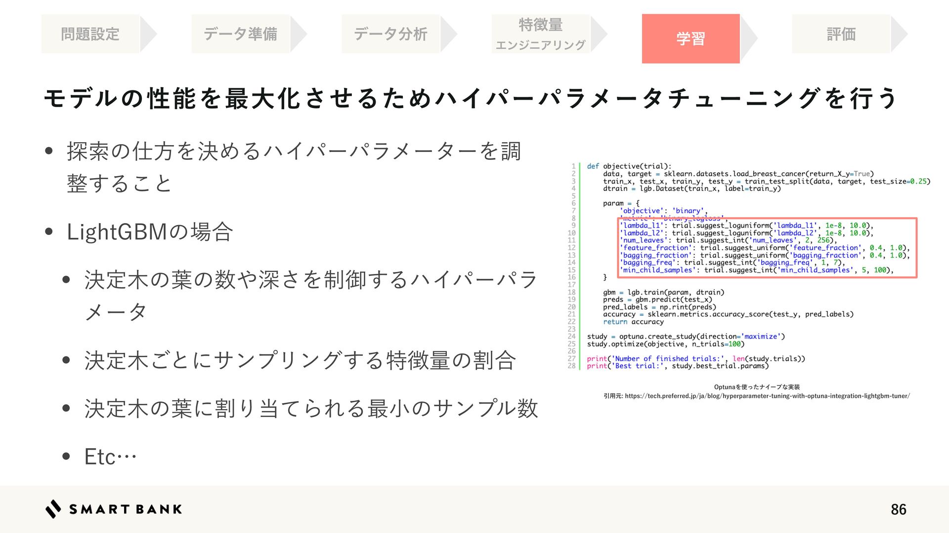 w ܾఆ໦͝ͱʹαϯϓϦϯά͢Δಛ௃ྔͷׂ߹ w ܾఆ໦ͷ༿ʹׂΓ౰ͯΒΕΔ࠷খͷαϯϓϧ਺ w &UDʜ ֶश ධՁ σʔλ४උ σʔλ෼ੳ ಛ௃ྔ ΤϯδχΞϦϯά 0QUVOBΛ࢖ͬͨφΠʔϒͳ࣮૷ Ҿ༻ݩIUUQTUFDIQSFGFSSFEKQKBCMPHIZQFSQBSBNFUFSUVOJOHXJUIPQUVOBJOUFHSBUJPOMJHIUHCNUVOFS ໰୊ઃఆ
