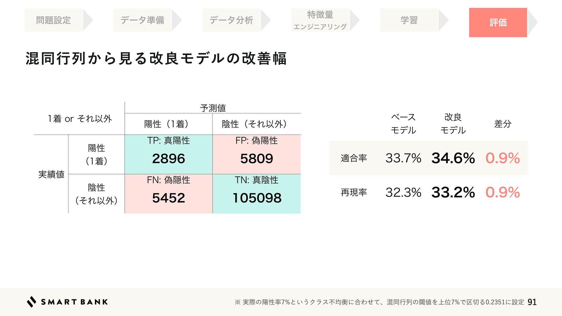 ༧ଌ஋ ཅੑʢணʣ ӄੑʢͦΕҎ֎ʣ ࣮੷஋ ཅੑ ʢணʣ 51ਅཅੑ  '1ِཅੑ  ӄੑ ʢͦΕҎ֎ʣ '/ِӅੑ  5/ਅӄੑ  ˞࣮ࡍͷཅੑ཰ͱ͍͏Ϋϥεෆۉߧʹ߹Θͤͯɺࠞಉߦྻͷᮢ஋Λ্ҐͰ۠੾Δʹઃఆ ϕʔε Ϟσϧ վྑ Ϟσϧ ࠩ෼ ద߹཰    ࠶ݱ཰