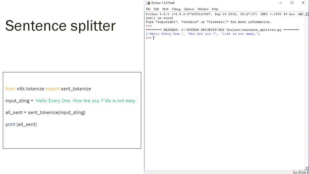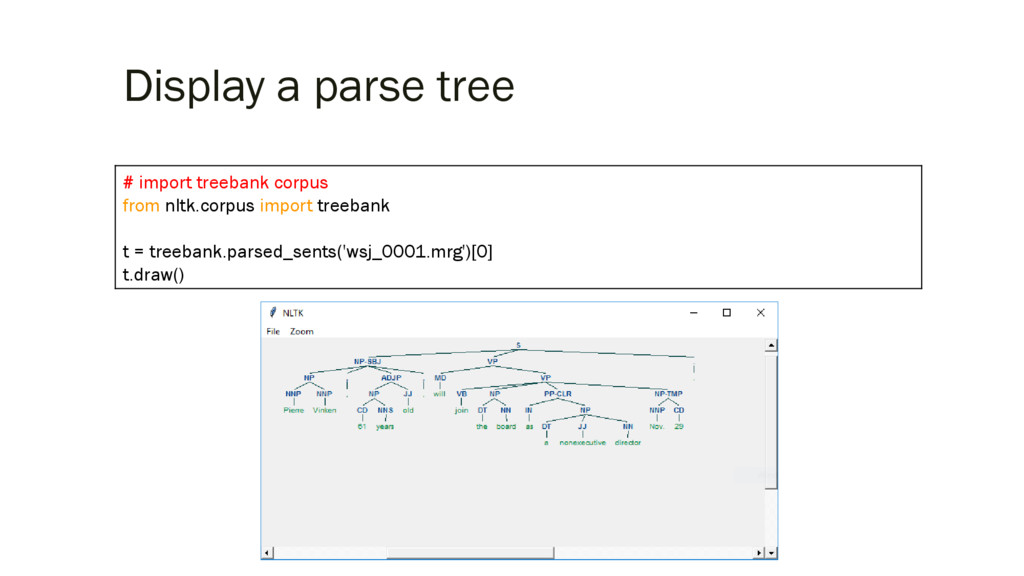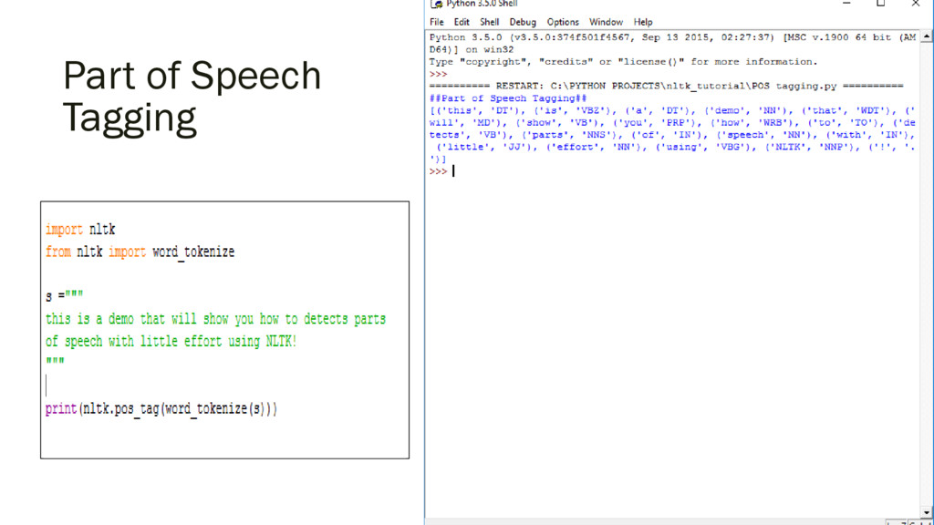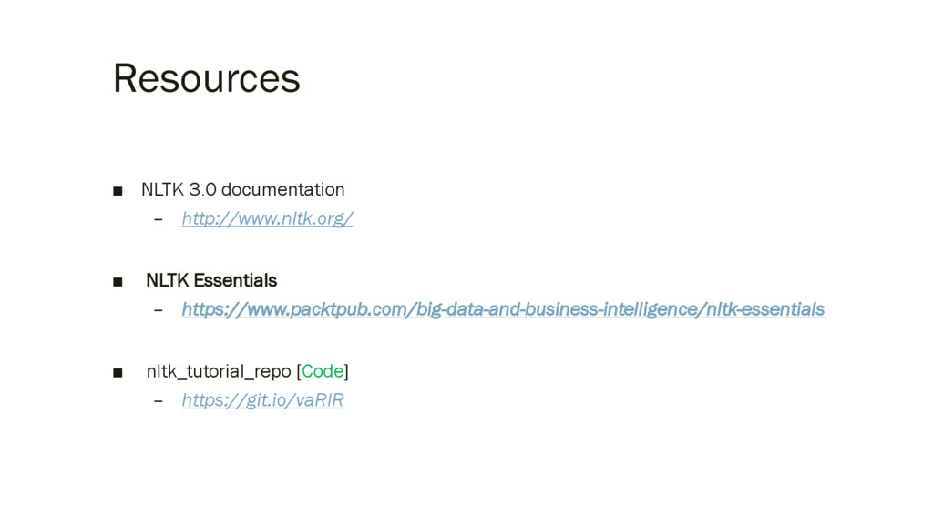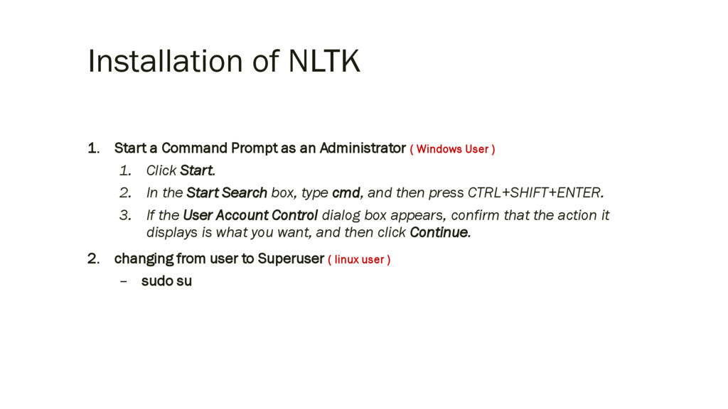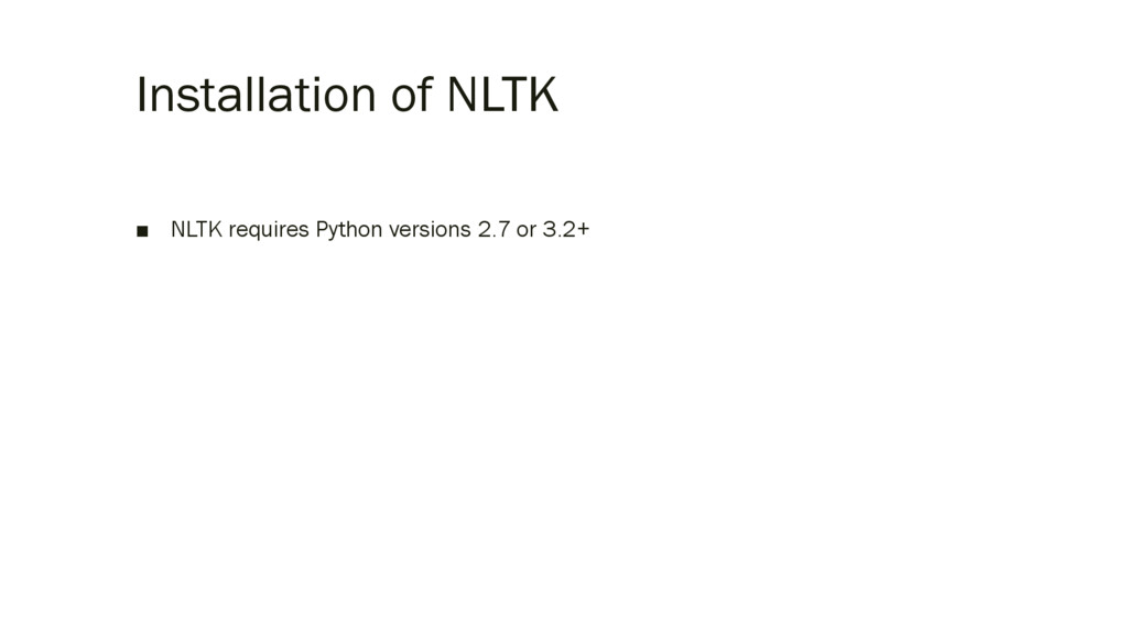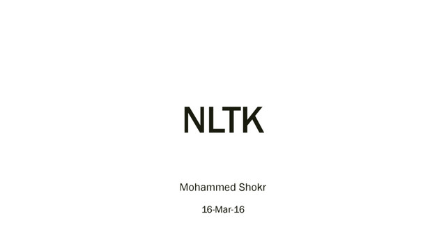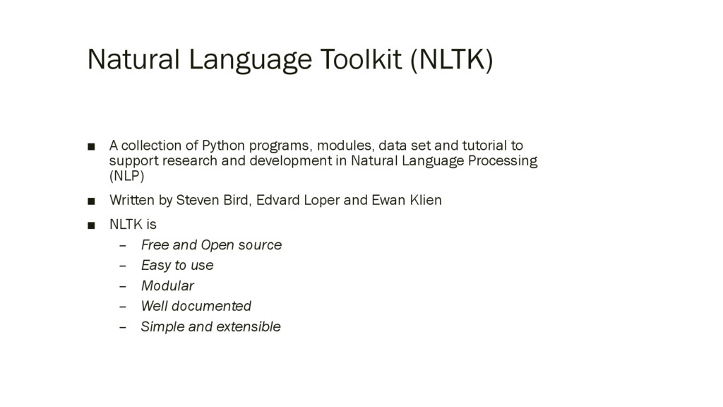 modules, data set and tutorial to support research and development in Natural Language Processing (NLP) ▪ Written by Steven Bird, Edvard Loper and Ewan Klien ▪ NLTK is – Free and Open source – Easy to use – Modular – Well documented – Simple and extensible