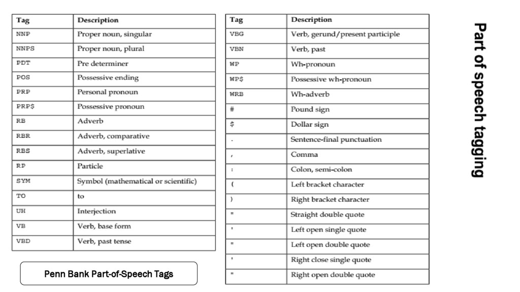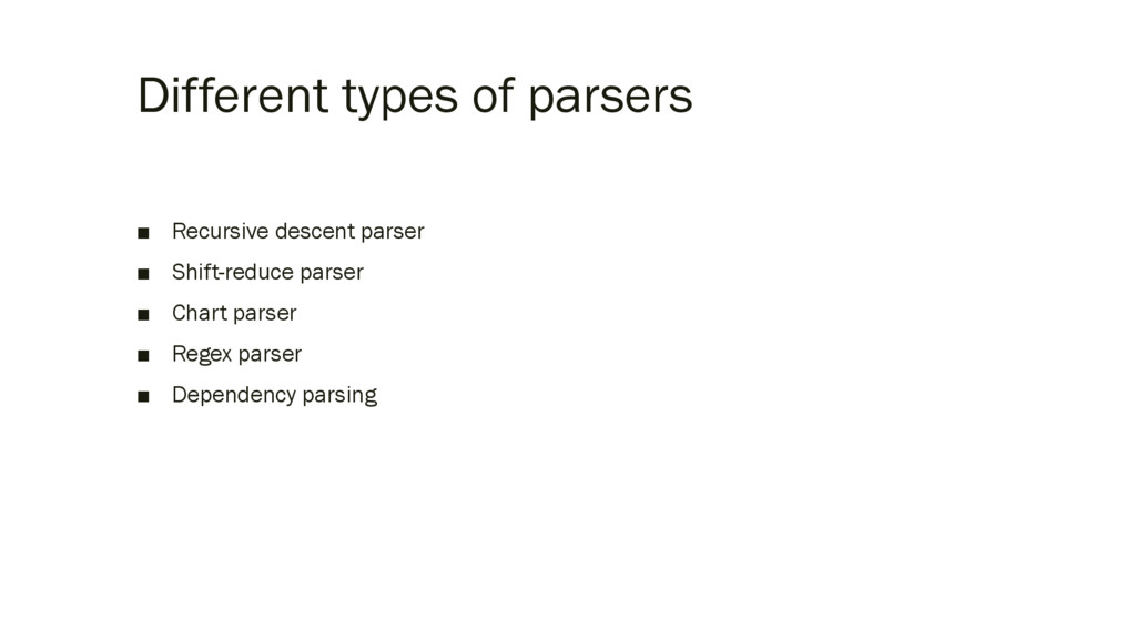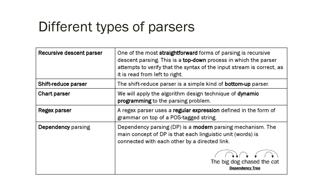 most straightforward forms of parsing is recursive descent parsing. This is a top-down process in which the parser attempts to verify that the syntax of the input stream is correct, as it is read from left to right. Shift-reduce parser The shift-reduce parser is a simple kind of bottom-up parser. Chart parser We will apply the algorithm design technique of dynamic programming to the parsing problem. Regex parser A regex parser uses a regular expression defined in the form of grammar on top of a POS-tagged string. Dependency parsing Dependency parsing (DP) is a modern parsing mechanism. The main concept of DP is that each linguistic unit (words) is connected with each other by a directed link.