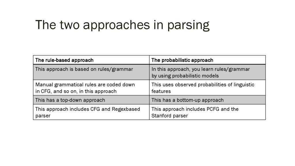 approach This approach is based on rules/grammar In this approach, you learn rules/grammar by using probabilistic models Manual grammatical rules are coded down in CFG, and so on, in this approach This uses observed probabilities of linguistic features This has a top-down approach This has a bottom-up approach This approach includes CFG and Regexbased parser This approach includes PCFG and the Stanford parser