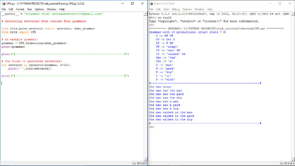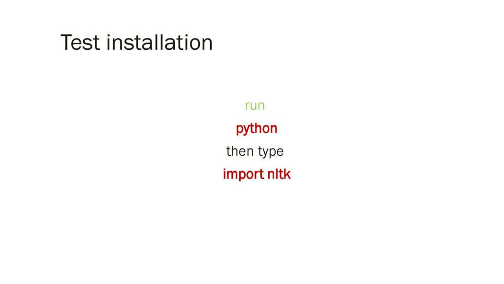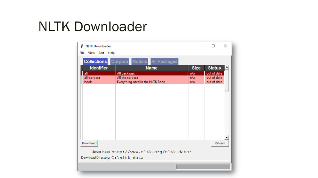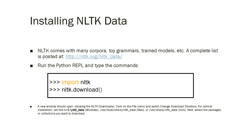 grammars, trained models, etc. A complete list is posted at: http://nltk.org/nltk_data/ ▪ Run the Python REPL and type the commands: ▪ A new window should open, showing the NLTK Downloader. Click on the File menu and select Change Download Directory. For central installation, set this to C:\nltk_data (Windows), /usr/local/share/nltk_data (Mac), or /usr/share/nltk_data (Unix). Next, select the packages or collections you want to download. >>> import nltk >>> nltk.download()