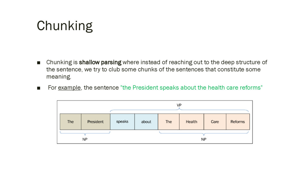 out to the deep structure of the sentence, we try to club some chunks of the sentences that constitute some meaning. ▪ For example, the sentence "the President speaks about the health care reforms"