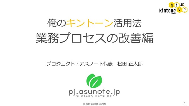 0 © 2019 project asunote 俺のキントーン活用法 業務プロセスの改善編 プロジェクト・アスノート代表 松田 正太郎
