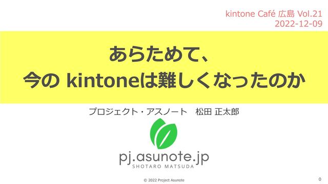 0 © 2022 Project Asunote あらためて、 今の kintoneは難しくなったのか プロジェクト・アスノート 松⽥