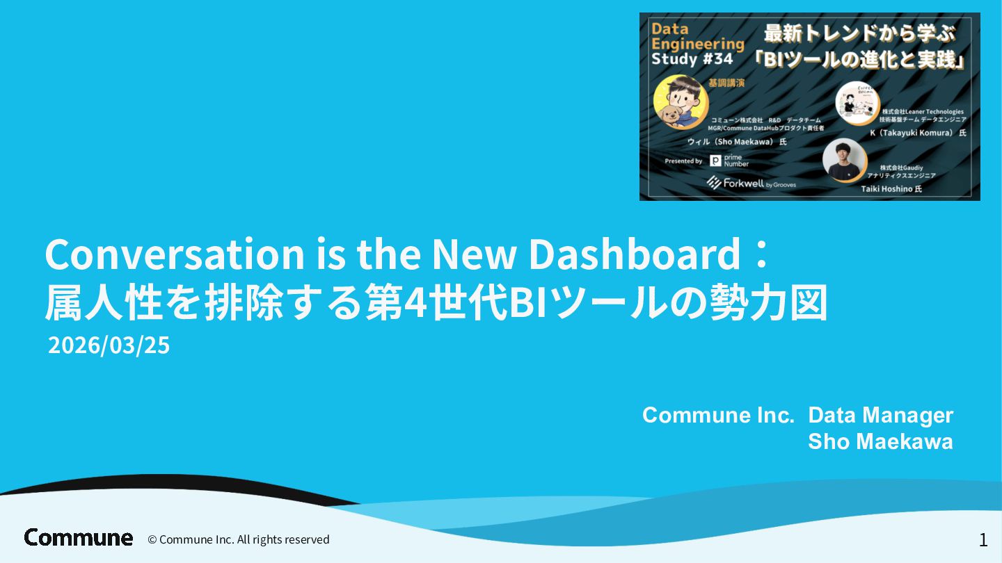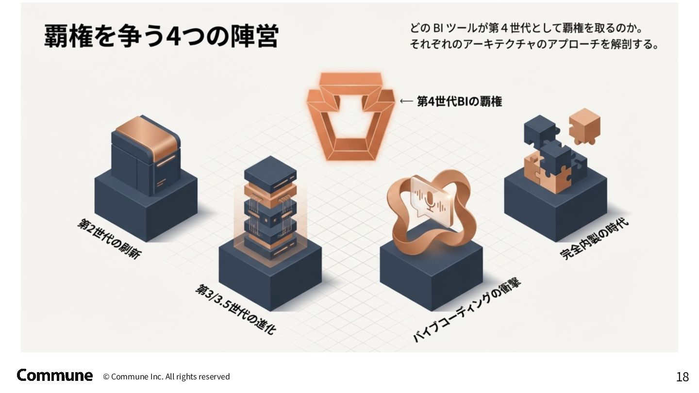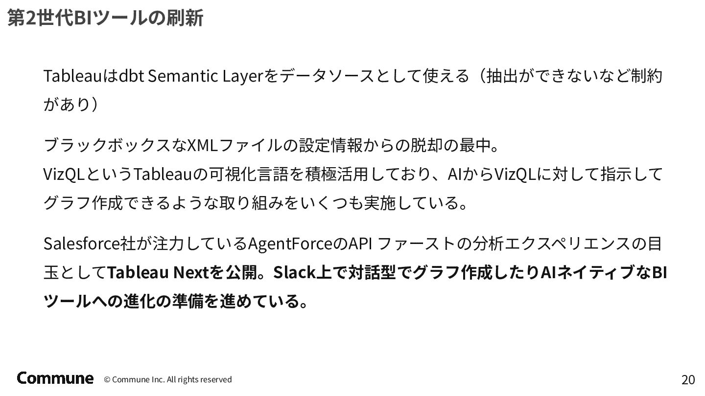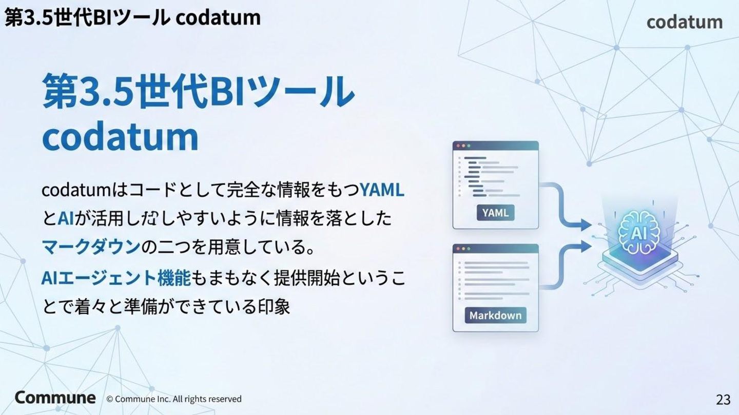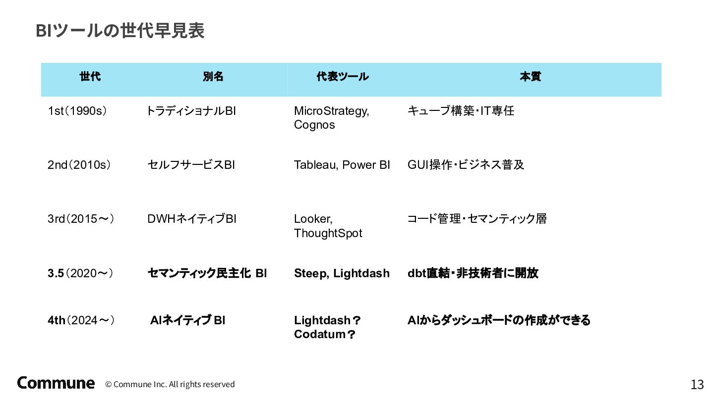 代表ツール 本質 1st(1990s) トラディショナルBI MicroStrategy, Cognos キューブ構築・IT専任 2nd(2010s) セルフサービスBI Tableau, Power BI GUI操作・ビジネス普及 3rd(2015〜) DWHネイティブBI Looker, ThoughtSpot コード管理・セマンティック層 3.5(2020〜) セマンティック民主化 BI Steep, Lightdash dbt直結・非技術者に開放 4th(2024〜) AIネイティブ BI Lightdash? Codatum? AIからダッシュボードの作成ができる