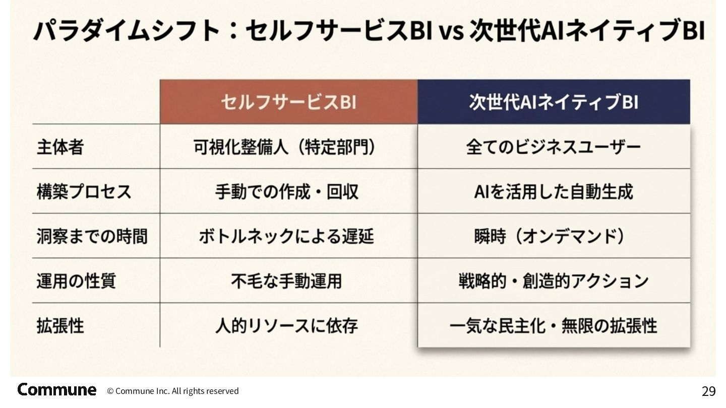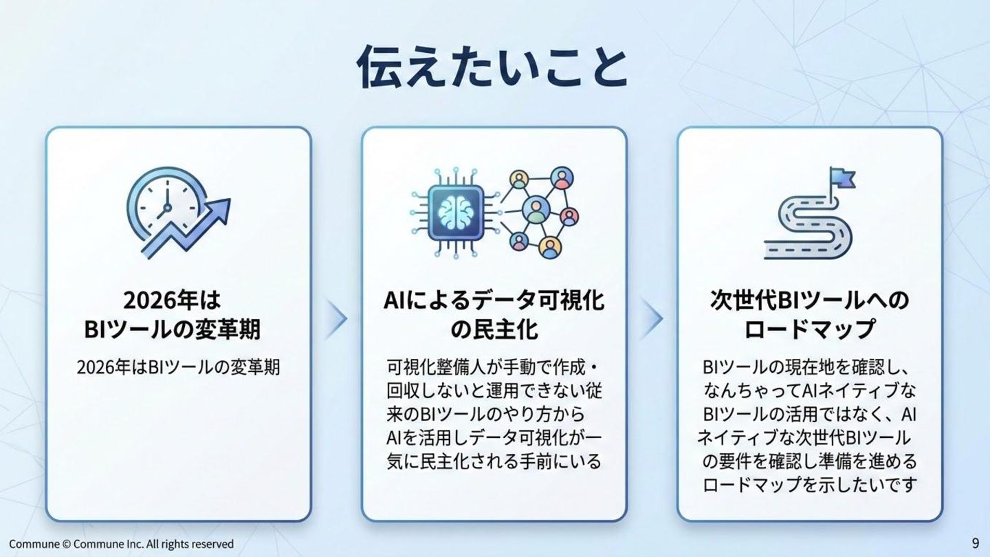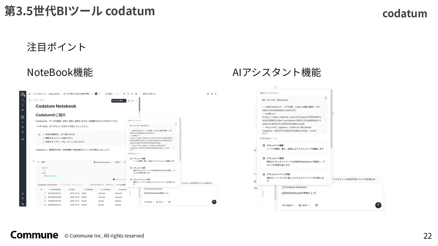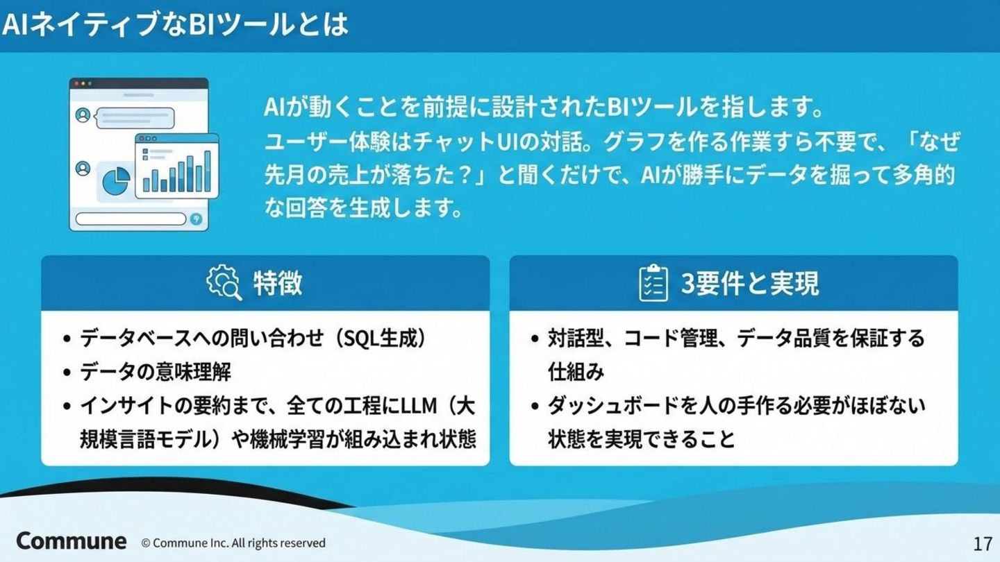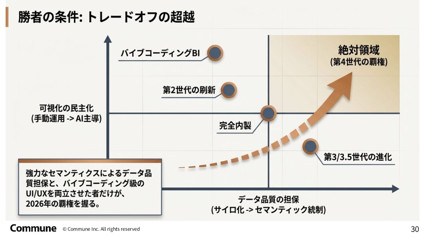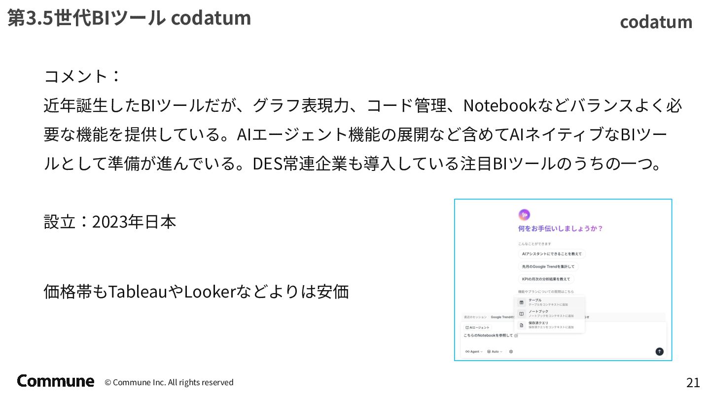 代表ツール 本質 1st(1990s) トラディショナルBI MicroStrategy, Cognos キューブ構築・IT専任 2nd(2010s) セルフサービスBI Tableau, Power BI GUI操作・ビジネス普及 3rd(2015〜) DWHネイティブBI Looker, ThoughtSpot コード管理・セマンティック層 3.5(2020〜) セマンティック民主化 BI Steep, Lightdash dbt直結・非技術者に開放 4th(2024〜) AIネイティブ BI Lightdash? Codatum? AIからダッシュボードの作成ができる