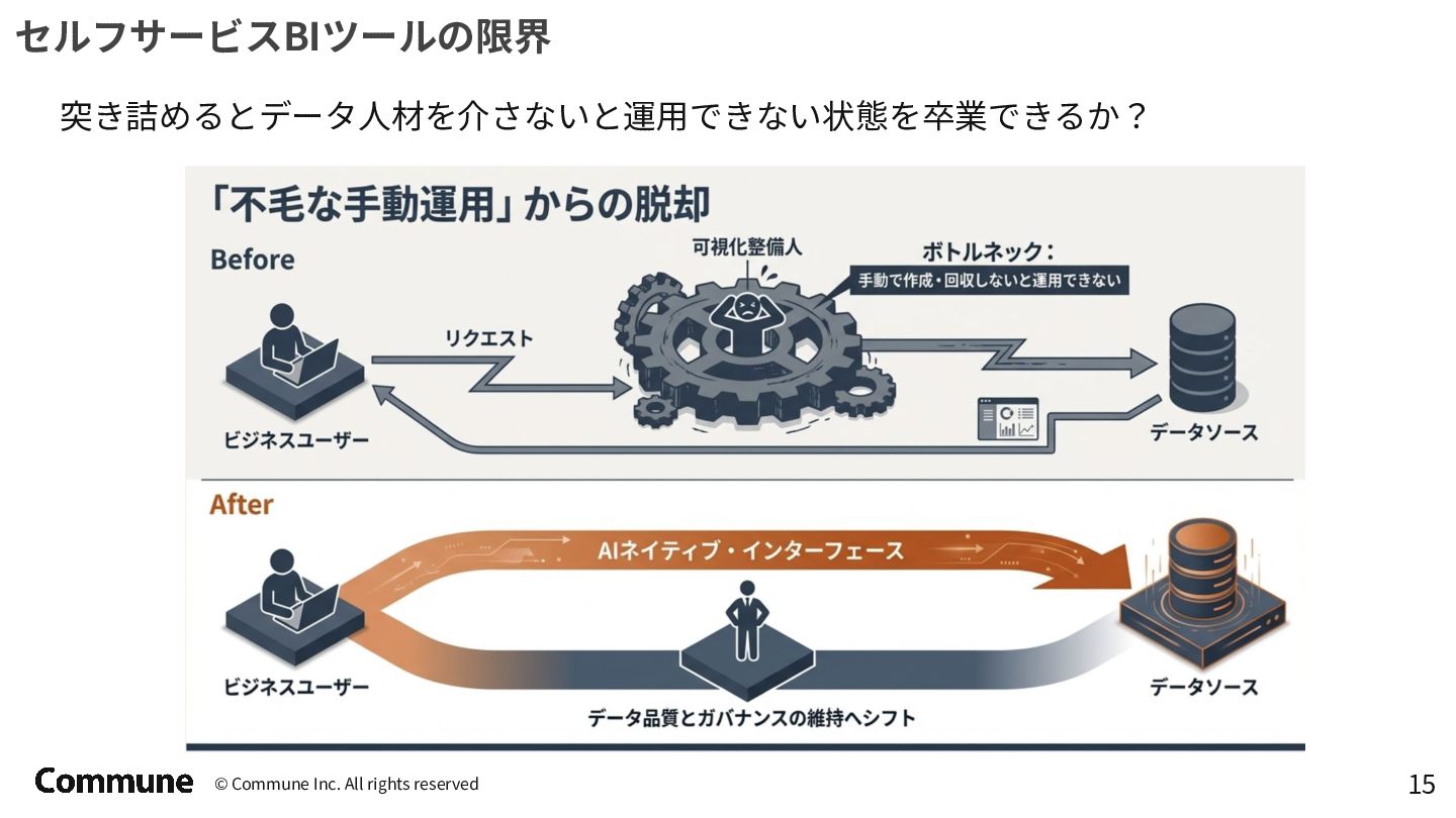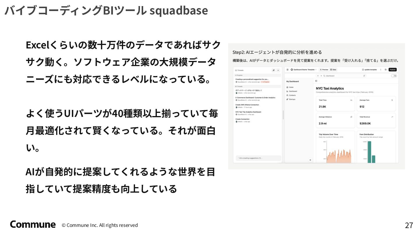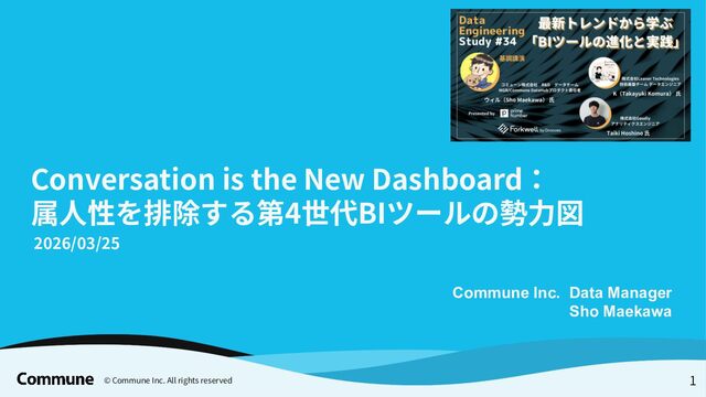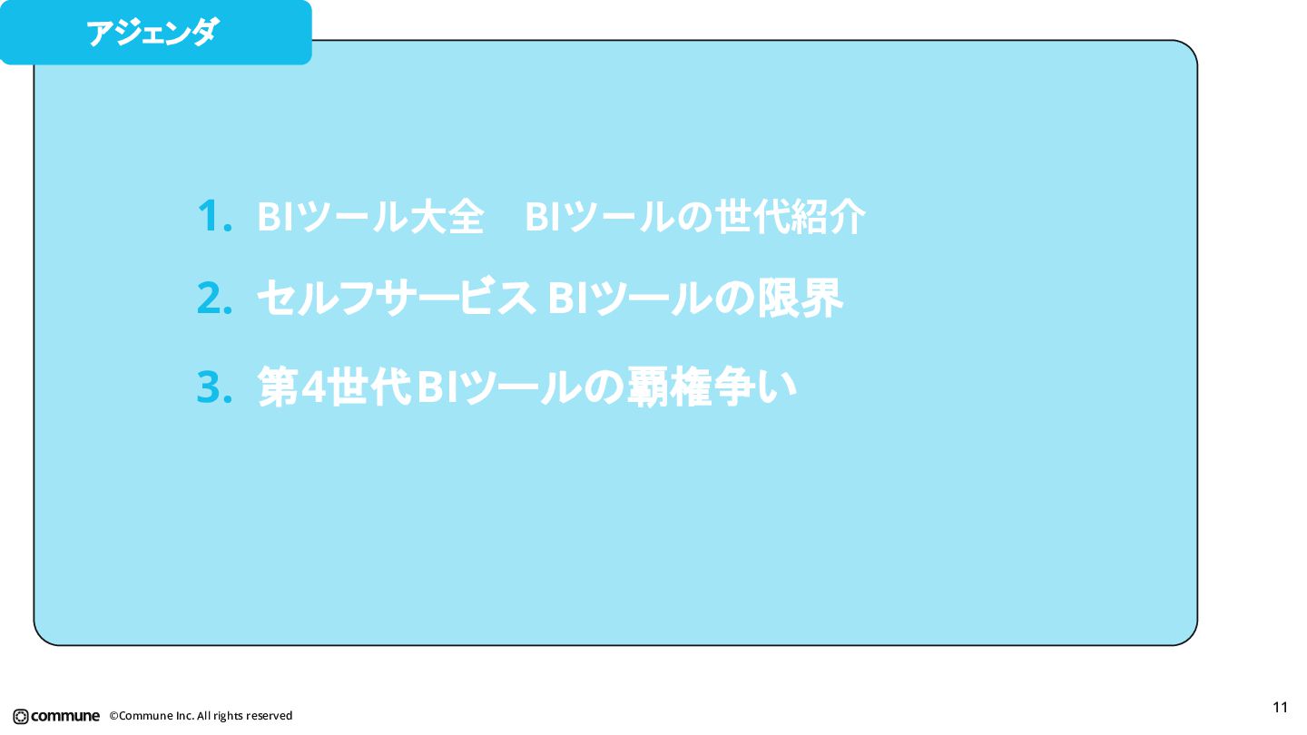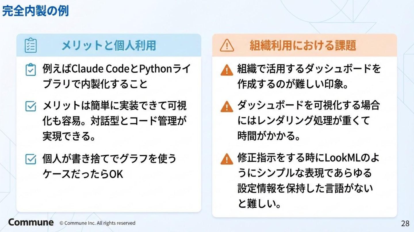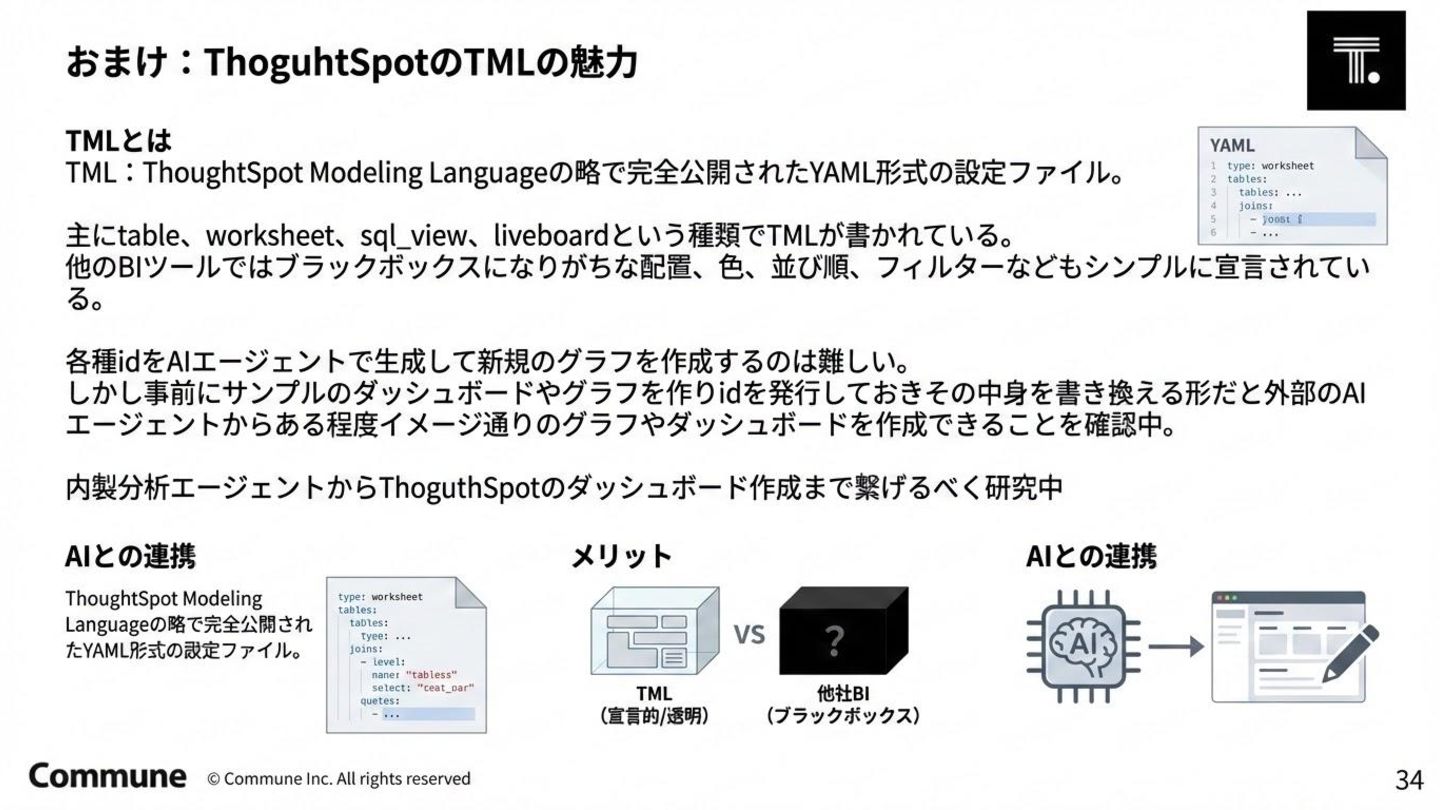 代表ツール 本質 1st(1990s) トラディショナルBI MicroStrategy, Cognos キューブ構築・IT専任 2nd(2010s) セルフサービスBI Tableau, Power BI GUI操作・ビジネス普及 3rd(2015〜) DWHネイティブBI Looker, ThoughtSpot コード管理・セマンティック層 3.5(2020〜) セマンティック民主化 BI Steep, Lightdash dbt直結・非技術者に開放 4th(2024〜) AIネイティブ BI Lightdash? Codatum? AIからダッシュボードの作成ができる