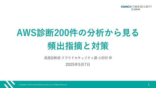 1 高度診断部 クラウドセキュリティ課 小田切 祥 2025年5月7日 AWS診断200件の分析から見る 頻出指摘と対策