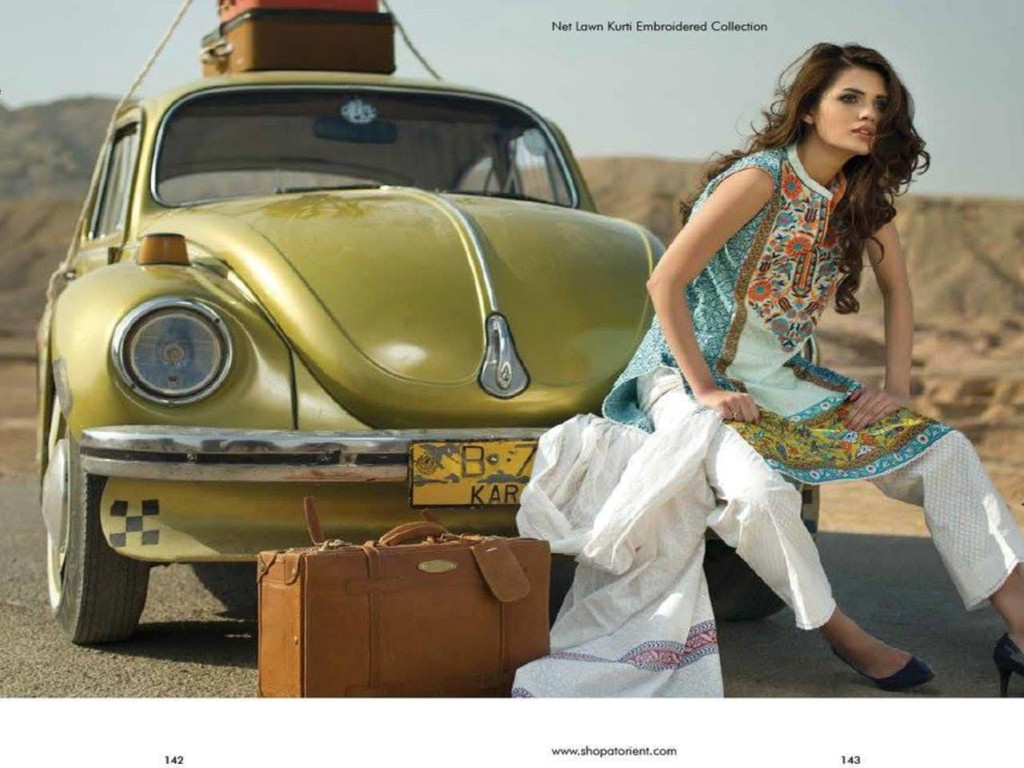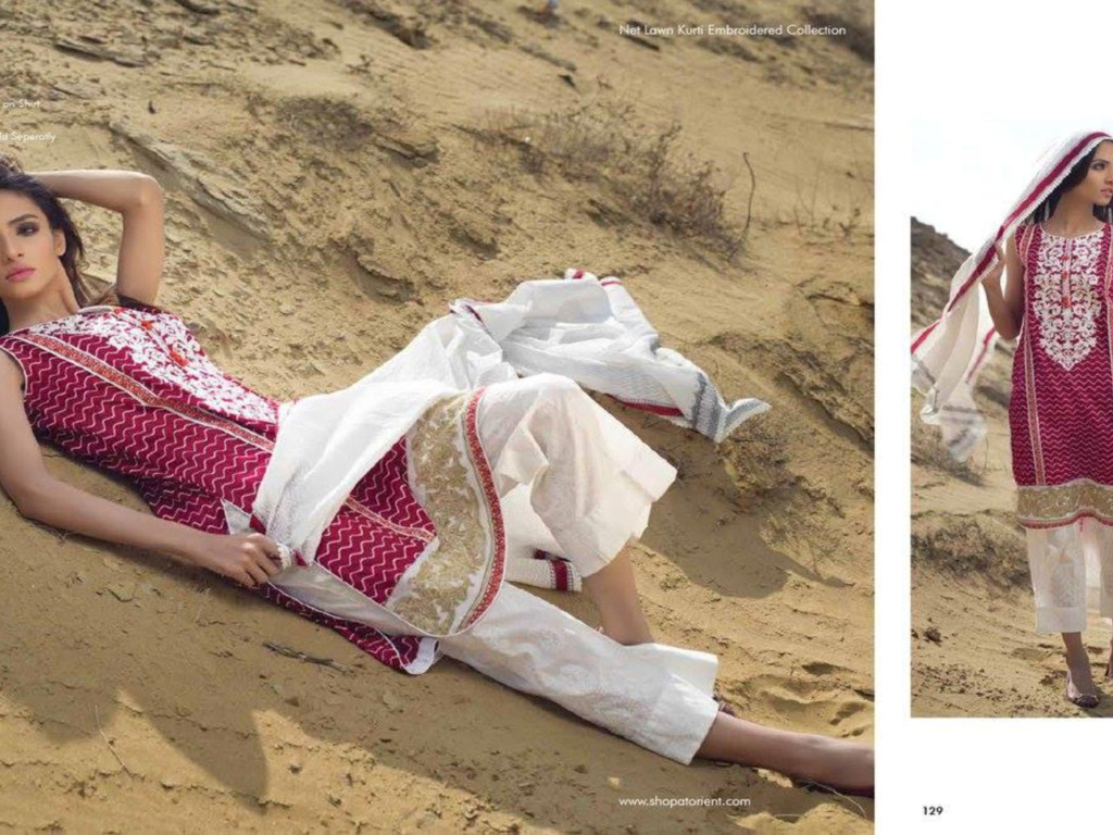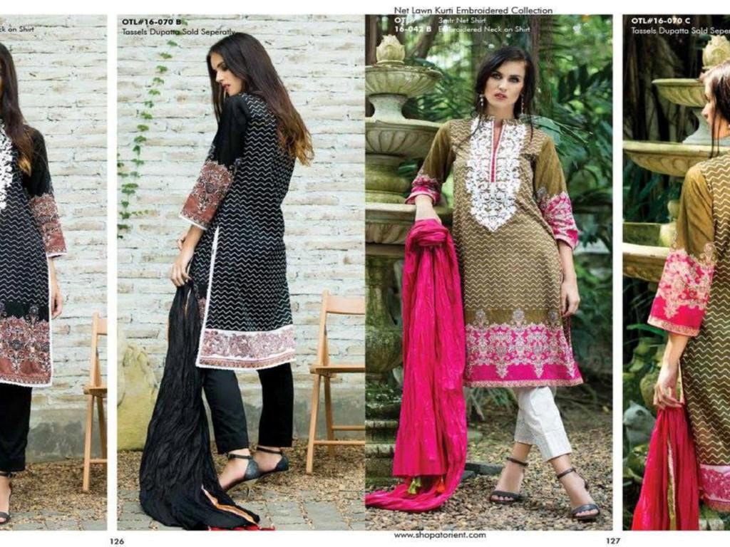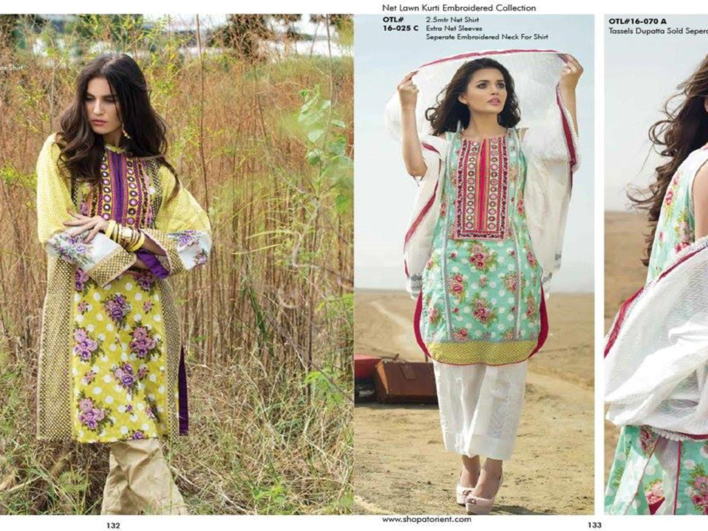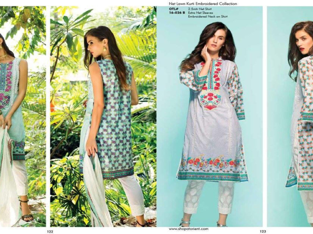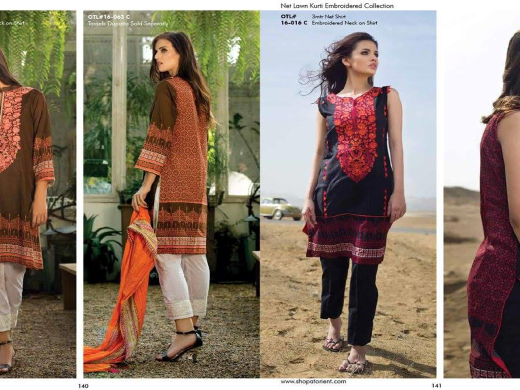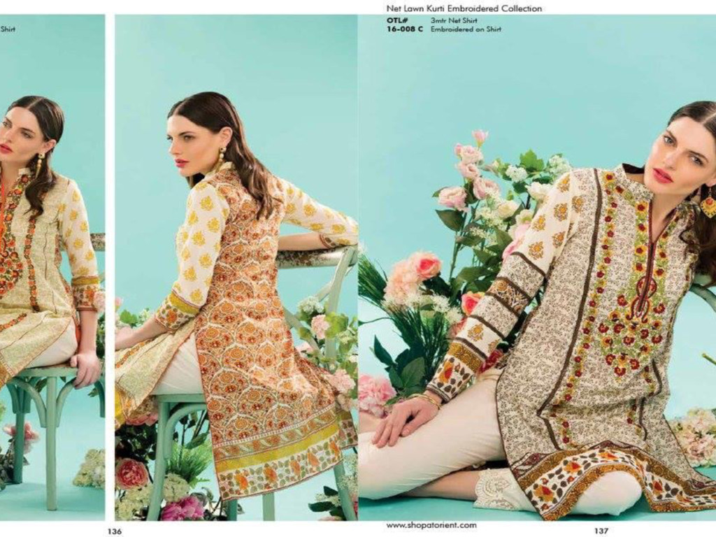Orient Textiles has brilliantly design every single dress with incredible patterns of a variety of ornate, botanic and abstract prints, to build this anthology more striking, every single dress using this set has ornamented with embroideries and numerous motifs around on neckline and border of t-shirts. You will get 3 Pieces dress both in stitched and unstitched forms. For more information, visit us at www.shopatorient.com/net-lawn-kurti-embroidered
