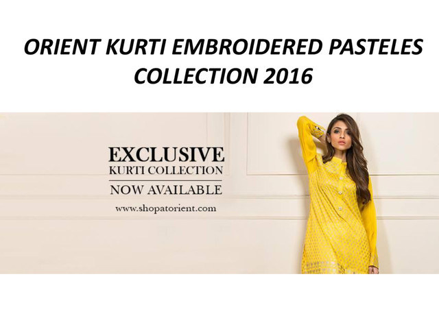Orient is going to make you classier in this season with its latest Orient Textiles Summer Kurti Embroidered Pasteles Collection 2016. In this Spring Summer Collection you will discover so a lot of fabrics assortments like cotton, grass, cloth, silk, velvet are supported with distinctive plans like tribox, mosaic, colorful isjaal, kanti butti, stylish paisley sketch, paisley combination and present day strips.Orient Textiles Spring Summer 2016 for women has embellished with lovely prints and some lace work.This is a perfect causal wear collection for young & Styylish girls. For more information, visit us at www.shopatorient.com/kurti-embroidered-pasteles