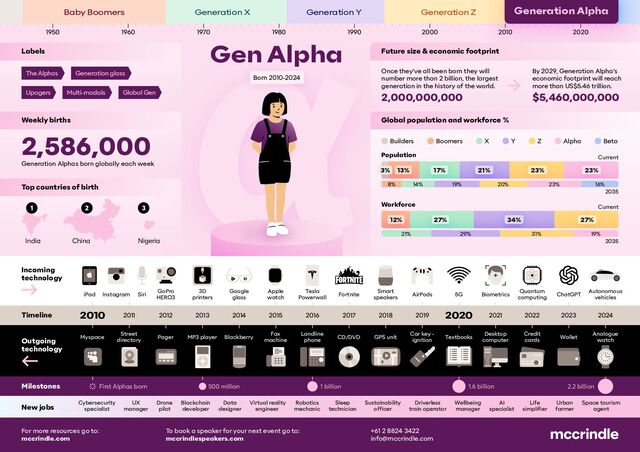 Alpha Born 2010-2024 Generation Alpha Weekly births Labels Future size & economic footprint Top countries of birth 1950 1960 1970 1980 1990 2000 2010 2020 2,586,000 Global population and workforce % Population Workforce Driverless train operator Sustainability officer Cybersecurity specialist UX manager Blockchain developer Data designer Virtual reality engineer Sleep technician Life simplifier Urban farmer Space tourism agent AI specialist Robotics mechanic Drone pilot Wellbeing manager Myspace Street directory Pager MP3 player Blackberry Fax machine Landline phone CD/DVD GPS unit Car key - ignition Textbooks Desktop computer Credit cards Wallet Analogue watch iPad Instagram Google glass Siri 3D printers GoPro HERO3 Apple watch Tesla Powerwall Fortnite Smart speakers AirPods 5G Biometrics Autonomous vehicles Quantum computing ChatGPT 2010 2020 2011 2012 2013 2014 2021 2022 2023 2024 2016 2017 2018 2019 2015 New jobs Incoming technology Timeline Outgoing technology Milestones First Alphas born 500 million 1 billion 1.6 billion 2.2 billion Builders Boomers X Y Z Alpha Beta Generation Alphas born globally each week $5,460,000,000 2,000,000,000 By 2029, Generation Alpha's economic footprint will reach more than US$5.46 trillion. Once they’ve all been born they will number more than 2 billion, the largest generation in the history of the world. 1 2 3 India China Nigeria 27% 27% 12% 34% 23% 17% 13% 3% 21% 23% Upagers Multi-modals Generation glass Global Gen The Alphas Current 2035 Current 2035 8% 14% 19% 20% 23% 21% 29% 31% 19% 16% +61 2 8824 3422