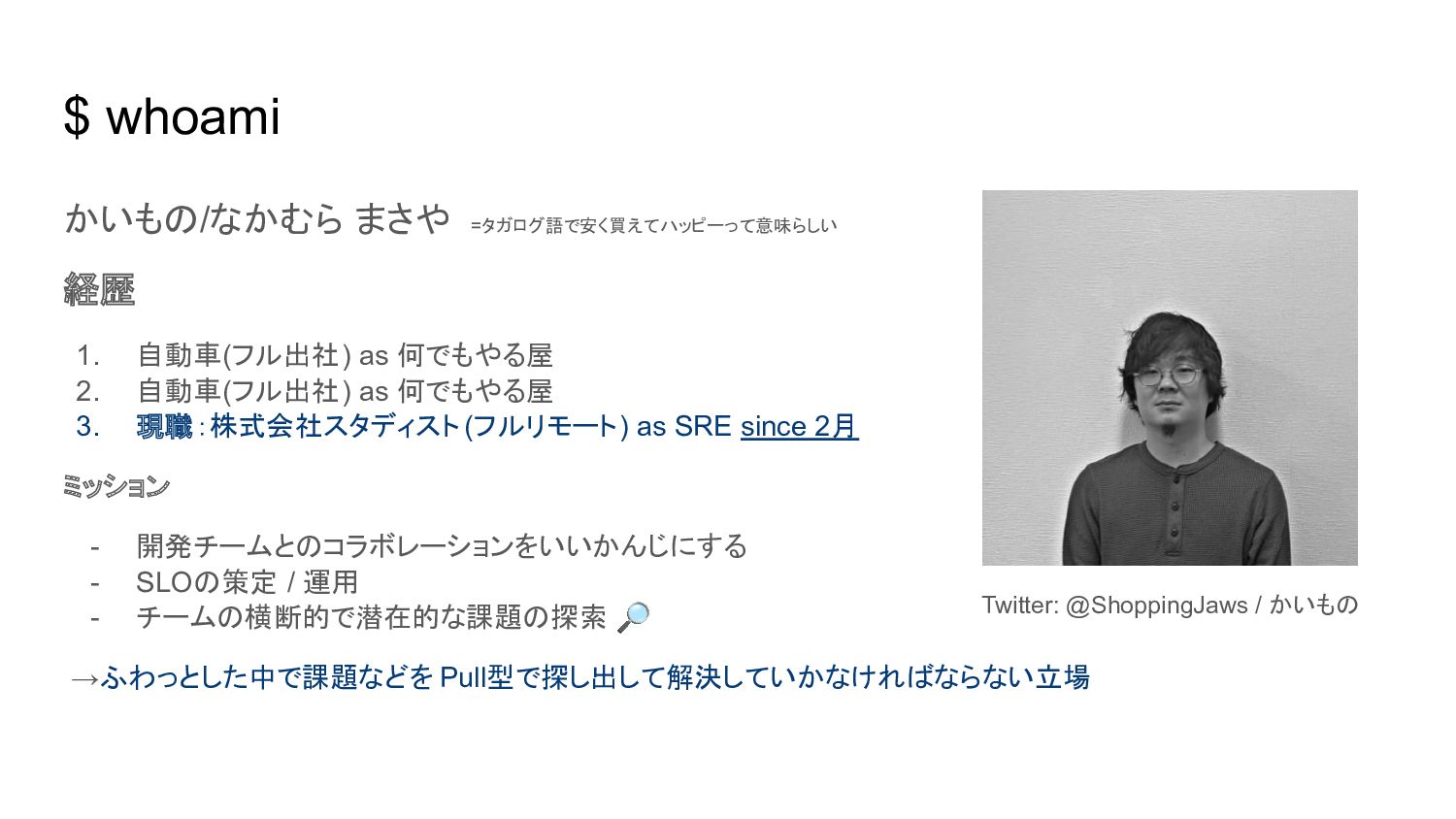 2. 自動車(フル出社) as 何でもやる屋 3. 現職:株式会社スタディスト (フルリモート) as SRE since 2月 ミッション - 開発チームとのコラボレーションをいいかんじにする - SLOの策定 / 運用 - チームの横断的で潜在的な課題の探索 🔎 →ふわっとした中で課題などを Pull型で探し出して解決していかなければならない立場 Twitter: @ShoppingJaws / かいもの