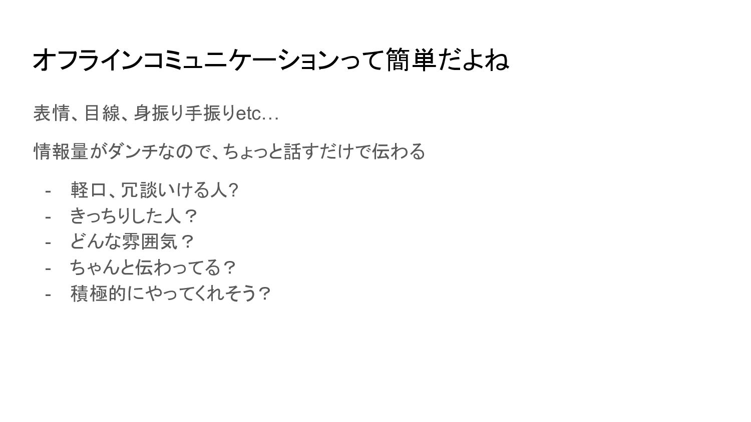 オフラインコミュニケーションって簡単だよね 表情、目線、身振り手振りetc… 情報量がダンチなので、ちょっと話すだけで伝わる - 軽口、冗談いける人? - きっちりした人? - どんな雰囲気? -