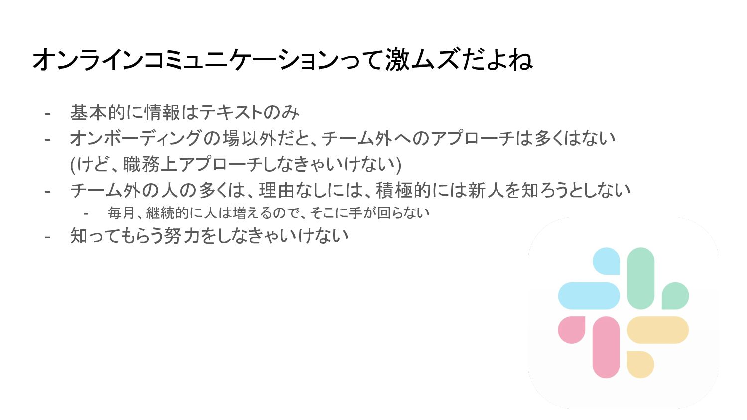 オンラインコミュニケーションって激ムズだよね - 基本的に情報はテキストのみ - オンボーディングの場以外だと、チーム外へのアプローチは多くはない (けど、職務上アプローチしなきゃいけない) - チーム外の人の多くは、理由なしには、積極的には新人を知ろうとしない - 毎月、継続的に人は増えるので、そこに手が回らない