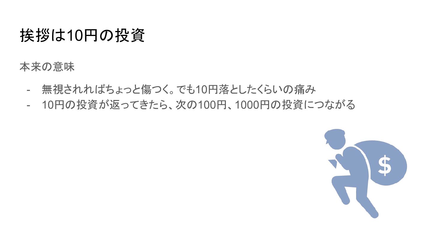 挨拶は10円の投資 本来の意味 - 無視されればちょっと傷つく。でも10円落としたくらいの痛み - 10円の投資が返ってきたら、次の100円、1000円の投資につながる