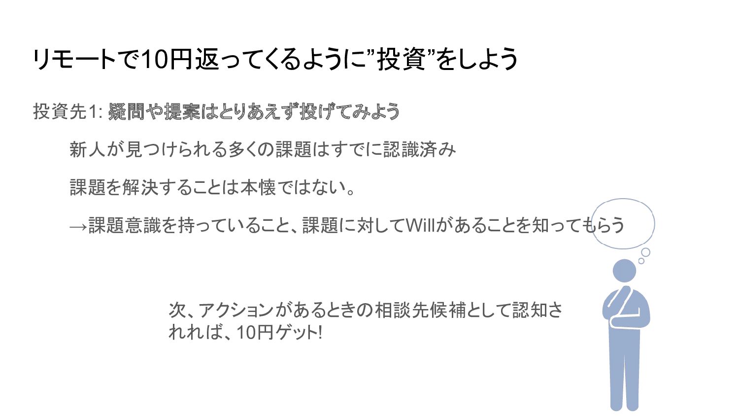 リモートで10円返ってくるように”投資”をしよう 投資先1: 疑問や提案はとりあえず投げてみよう 新人が見つけられる多くの課題はすでに認識済み 課題を解決することは本懐ではない。 →課題意識を持っていること、課題に対してWillがあることを知ってもらう 次、アクションがあるときの相談先候補として認知さ れれば、10円ゲット!