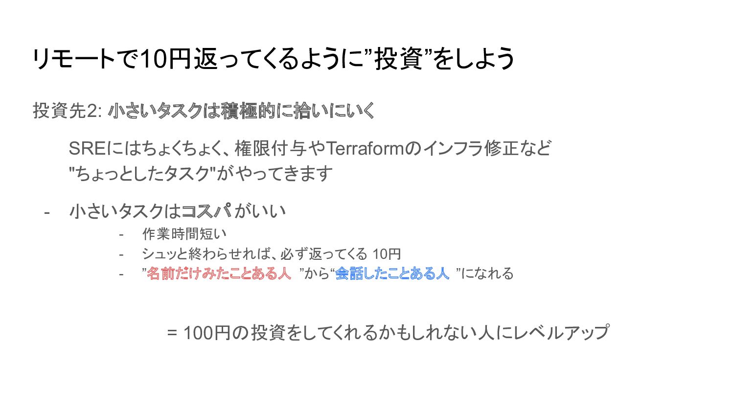 リモートで10円返ってくるように”投資”をしよう 投資先2: 小さいタスクは積極的に拾いにいく SREにはちょくちょく、権限付与やTerraformのインフラ修正など "ちょっとしたタスク"がやってきます - 小さいタスクはコスパがいい - 作業時間短い -