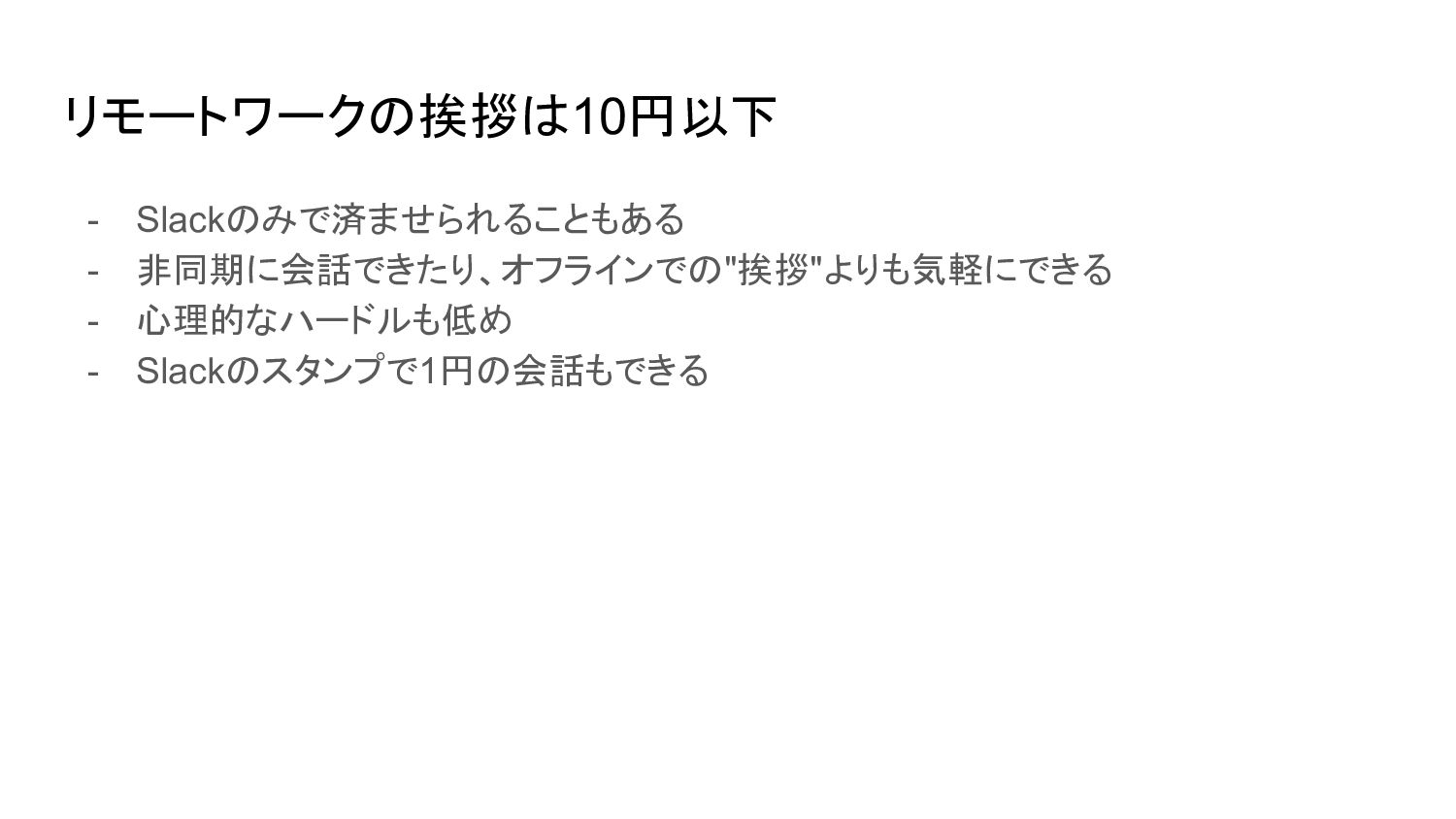 リモートワークの挨拶は10円以下 - Slackのみで済ませられることもある - 非同期に会話できたり、オフラインでの"挨拶"よりも気軽にできる - 心理的なハードルも低め - Slackのスタンプで1円の会話もできる