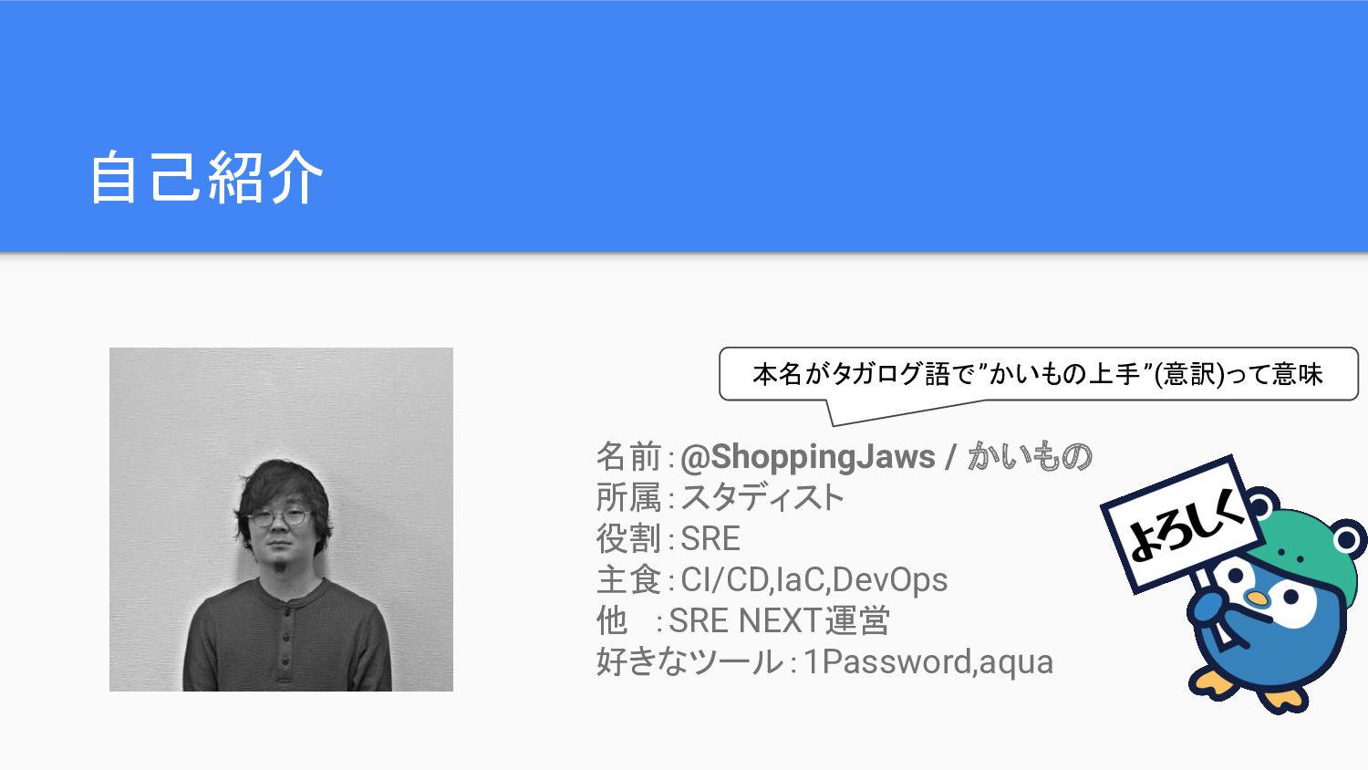 自己紹介 名前:@ShoppingJaws / かいもの 所属:スタディスト 役割:SRE 主食:CI/CD,IaC,DevOps 他 :SRE NEXT運営 好きなツール:1Password,aqua