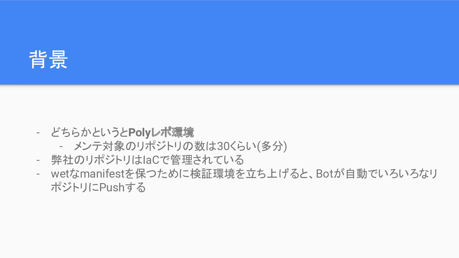 背景 - どちらかというとPolyレポ環境 - メンテ対象のリポジトリの数は30くらい(多分) - 弊社のリポジトリはIaCで管理されている - wetなmanifestを保つために検証環境を立ち上げると、Botが自動でいろいろなリ ポジトリにPushする
