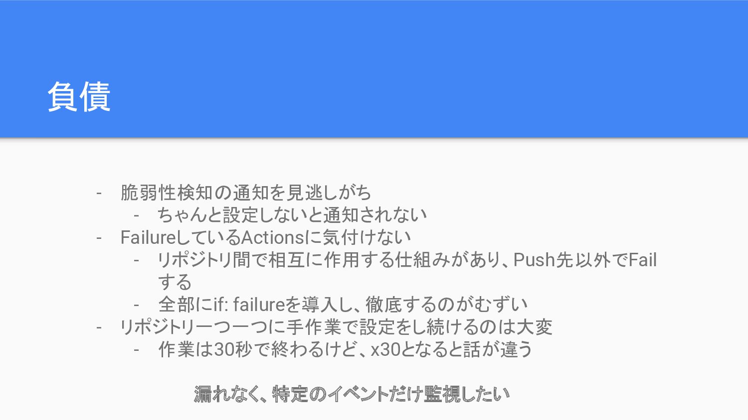 負債 - 脆弱性検知の通知を見逃しがち - ちゃんと設定しないと通知されない - FailureしているActionsに気付けない - リポジトリ間で相互に作用する仕組みがあり、Push先以外でFail する