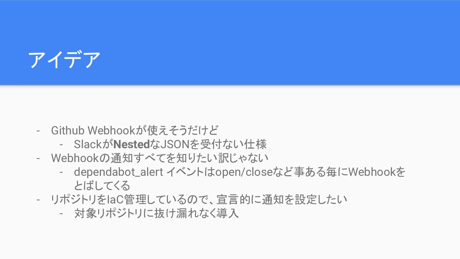 アイデア - Github Webhookが使えそうだけど - SlackがNestedなJSONを受付ない仕様 - Webhookの通知すべてを知りたい訳じゃない - dependabot_alert