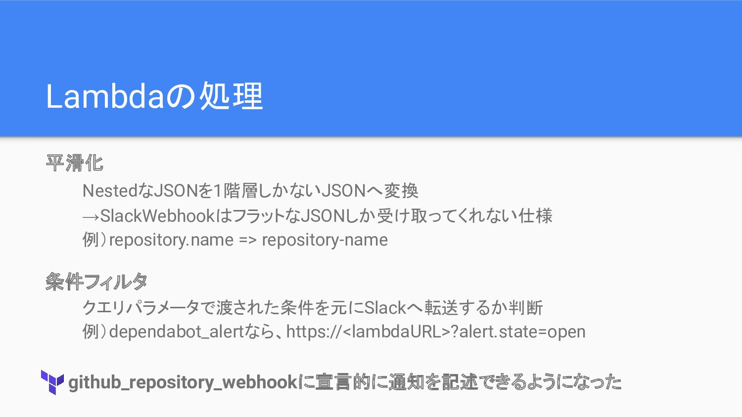 Lambdaの処理 平滑化 NestedなJSONを1階層しかないJSONへ変換 →SlackWebhookはフラットなJSONしか受け取ってくれない仕様 例)repository.name => repository-name 条件フィルタ クエリパラメータで渡された条件を元にSlackへ転送するか判断 例)dependabot_alertなら、https://<lambdaURL>?alert.state=open