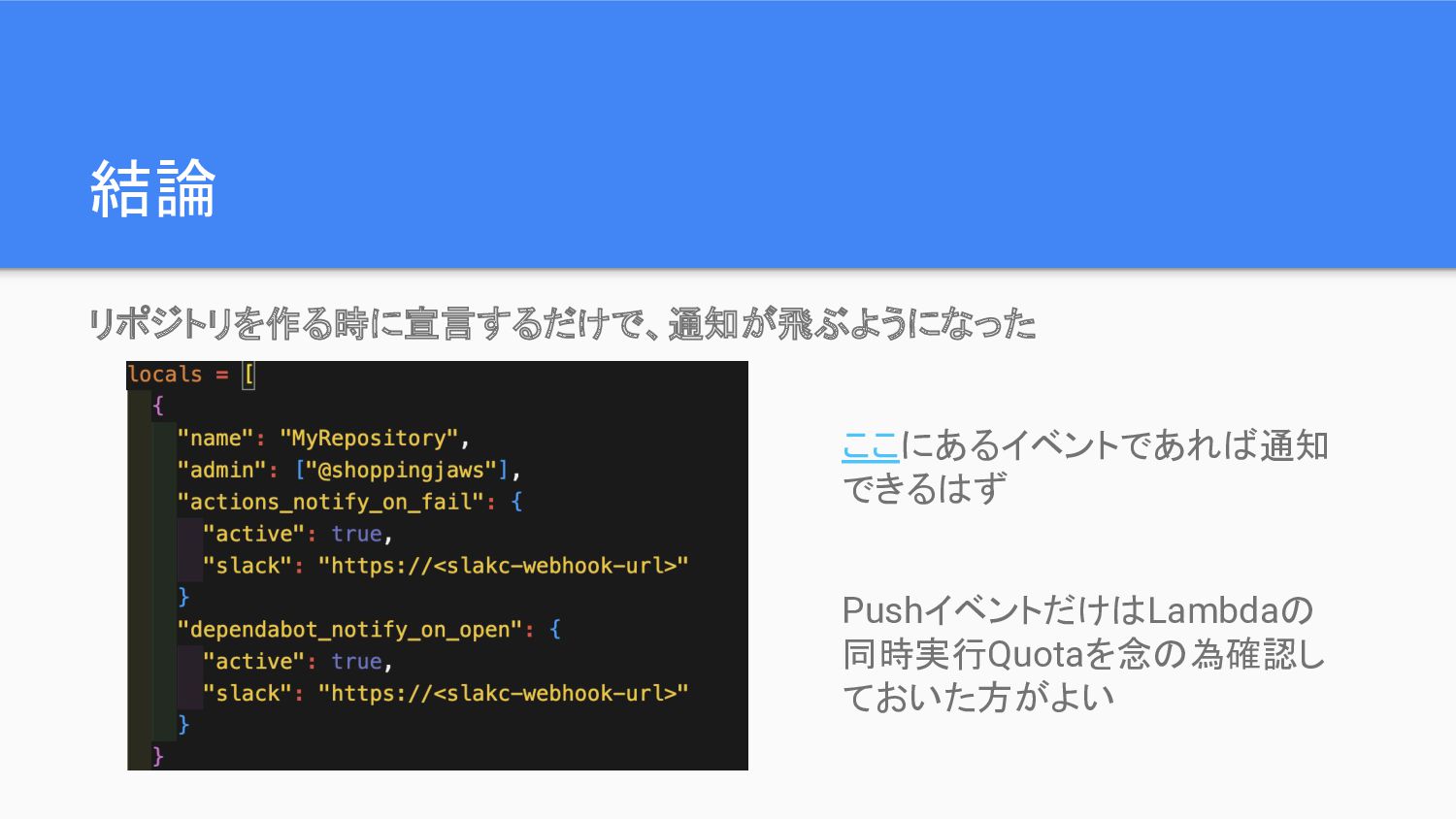 結論 リポジトリを作る時に宣言するだけで、通知が飛ぶようになった ここにあるイベントであれば通知 できるはず PushイベントだけはLambdaの 同時実行Quotaを念の為確認し ておいた方がよい